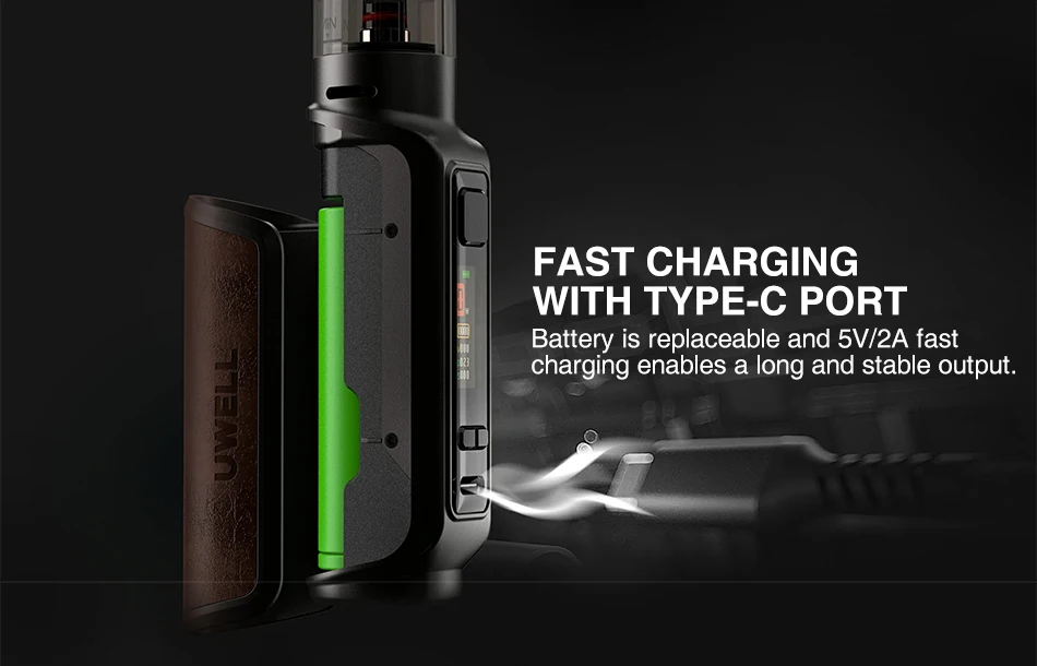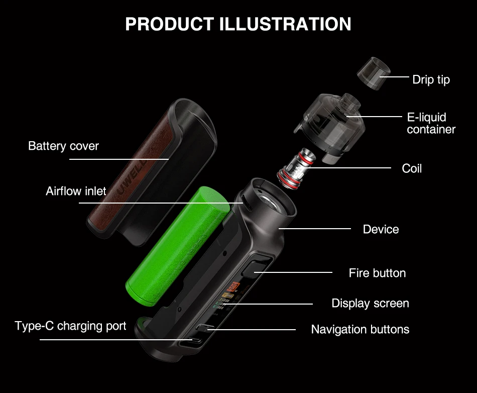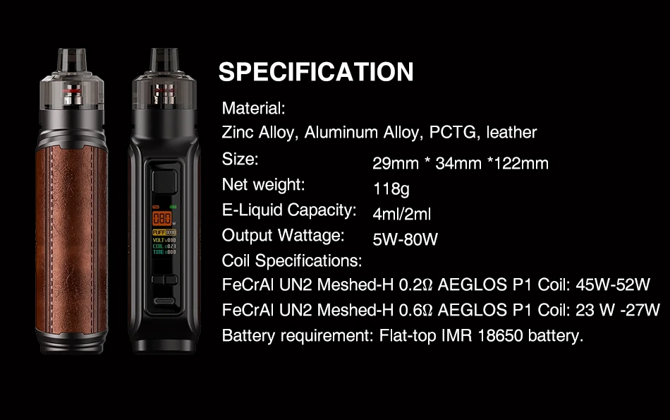 Uwell Aeglos P1 Kit est un appareil Pod Mod avec une taille exquise, cuir élégant incrusté dans le corps, confortable et antidérapant. La partie métallique du corps est en alliage de zinc et en alliage d’aluminium, et la texture mate est de haute qualité et durable. Retirez le couvercle de la batterie d’un côté, vous pouvez voir que le Kit Aeglos P1 est alimenté par une seule batterie 18650, qui est remplaçable et prend en charge la charge rapide de Type C 5V/2A. Livré avec un écran couleur TFT haute définition de 0.96 pouces, l’écran peut afficher clairement toutes les données et dispose d’un dispositif de verrouillage pour un tir accidentel. Le jeu de puces à l’intérieur fonctionne avec une protection de circuits multiples, offrant une sortie stable, sûre et fiable. C’est très drôle en raison du comptage des bouffantes pour garder une trace de votre vapotage. Quant au réservoir de dosette d’une capacité de 4ml, il s’adapte aux bobines de la série UN2 mesh, bobines préinstallées de 0.2 ohm qui apporteront une vaporisation DTL; et les bobines UN2 mesh-h 0.6 ohm apporteront la vaporisation RDL ou MTL. Doté de la technologie pro-focs pour assurer une saveur authentique du jus électronique, la cartouche et la bobine sont toutes deux remplaçables, remplacez-les quand c’est nécessaire. Livré avec un flux d’air réglable, il vous suffit de faire pivoter le pod pour l’ajuster aux différents besoins. Le remplissage est très simple et efficace, étanche, la cartouche de dosette avec magnétique, facile à installer. En outre, l’adaptateur disponible pour passer à un atomiseur avec une connexion 510. (L’adaptateur est disponible séparément.)
