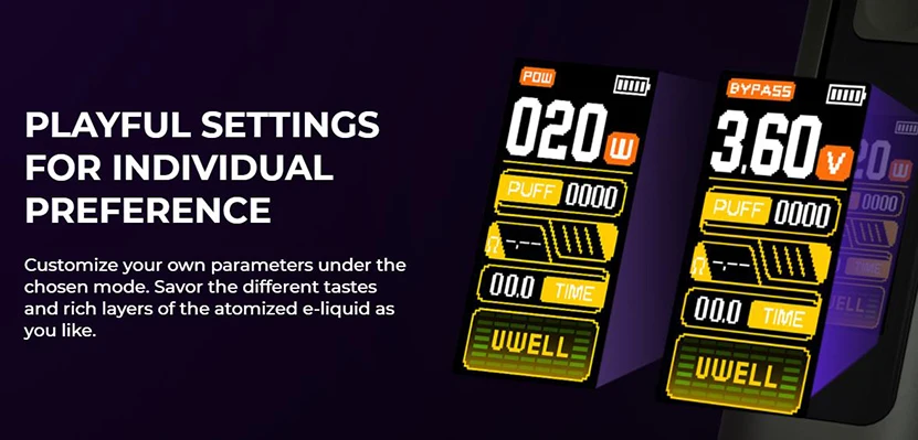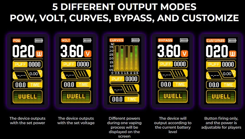 Crown D Kit, le nouveau membre des produits de la série Uwell Crown, est un produit vape multifonctionnel et puissant. La couronne D a une grande capacité de batterie de 1100mAh et dispose d’une plage de puissance de sortie de 5W à 35W. Vous pouvez voir les informations de vapotage en temps réel à travers l’écran TFT 0.96 pouces. Crown D prend en charge 5 modes de sortie différents (POW, VOLT, courbes, contournement et personnalisation), ce qui assure non seulement vos besoins de fonction de base, mais enrichit également l’expérience de vapotage. En mode courbes, vous pouvez régler différentes tensions pendant une période de vapotage; En mode de dérivation, l’appareil sortira en fonction du niveau de batterie actuel. En outre, il adopte la technologie d’ajustement de saveur pro-focs et le réglage pratique du flux d’air latéral. La cartouche peut contenir une capacité e-liquide de 3ml, dispose d’un remplissage par le haut et d’une connexion à dosette magnétique solide. Deux bobines à mailles sont ajoutées pour satisfaire le vapotage MTL jusqu’à DTL.