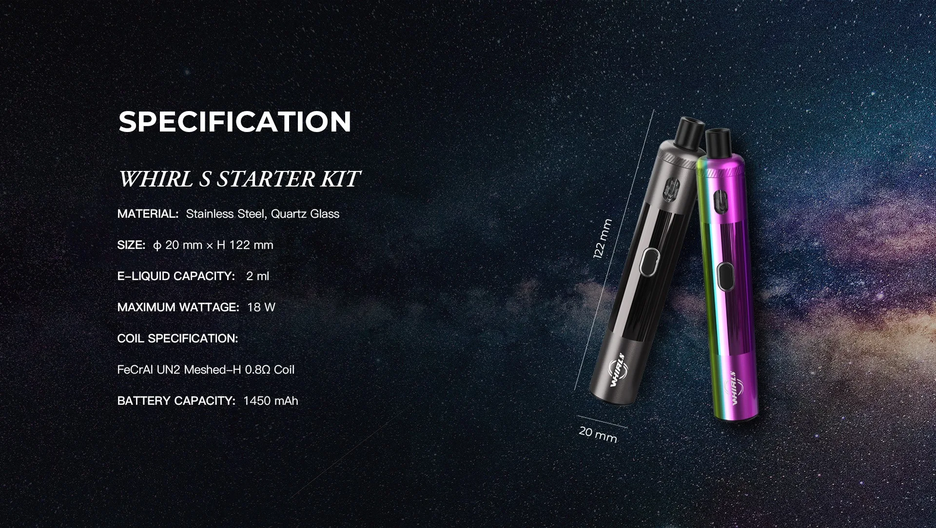 Uwell Whirl S est discret et simple à utiliser. Il offre une bonne introduction à la vaporisation et est fortement recommandé aux nouveaux vaporisateurs. Fabriqué en acier inoxydable et en verre de quartz, avec un design simple et clair, il est léger et facile à tenir tout en tenant compte de la durabilité. Le kit vapoteur Whirl S à tube mince dispose d’une batterie intégrée de 1450mAh avec une puissance de sortie maximale de 18 watts en mode dérivation et peut être rapidement chargé avec un courant de charge allant jusqu’à 2A via un câble type-c. Sauf pour le bouton de tir avec LED de couleur intégrée, il n’y a pas d’autres commandes sur ce mod, donc aucun réglage n’est requis. Fonctionnant avec un système de double tir, le kit Whirl S peut tirer en utilisant le bouton de tir intuitif unique ou un système de tir actif par tirage utile lorsqu’il est déverrouillé, offrant aux utilisateurs plus de flexibilité.