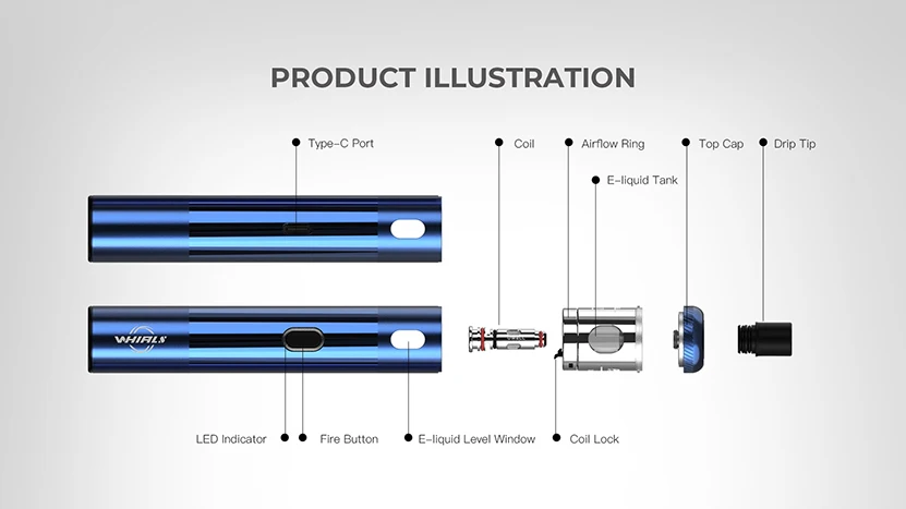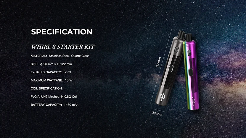Whirl S Kit est construit avec une capacité de batterie de 1450mAh avec une puissance maximale de 18W. Il dispose d’une capacité de 2ml de jus électronique et d’un système de remplissage facile. Le niveau d’e-liquide peut vous être montré avec un design de fenêtre. Un verrou de bobine est appliqué à Whirl S pour empêcher les enfants d’accéder à e-liquide. Et il est également livré avec un verrou enfant de capuchon supérieur (uniquement pour la version CRC). Vous pouvez obtenir RDL (limité directement au sein) ou MTL (bouche au sein) avec l’anneau de flux d’air réglable situé au fond du réservoir. De plus, le réservoir peut être démonté et nettoyé facilement à l’eau courante, ce qui rendra le nettoyage plus pratique et évitera que l’appareil ne soit endommagé par l’eau (veuillez retirer la bobine avant de nettoyer le réservoir). Whirl S Kit utilise la bobine de maille de 0,8 ohm et dispose de la technologie de test de saveur pro-focs pour vous apporter une excellente saveur. Vous pouvez le passer directement ou par le bouton. Le câble type-c facilitera le chargement. Il suffit de prendre Whirl S pour une vaporisation incroyable!