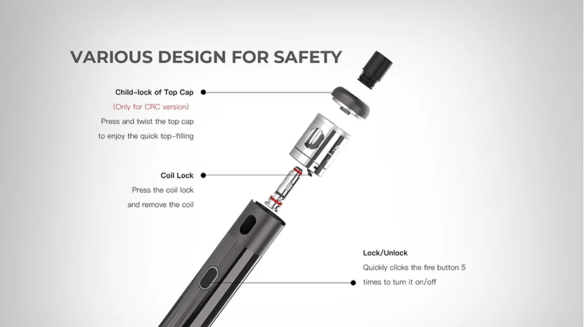 9. Conception de verrouillage de bobine pour empêcher les enfants d’accéder à e-liquide