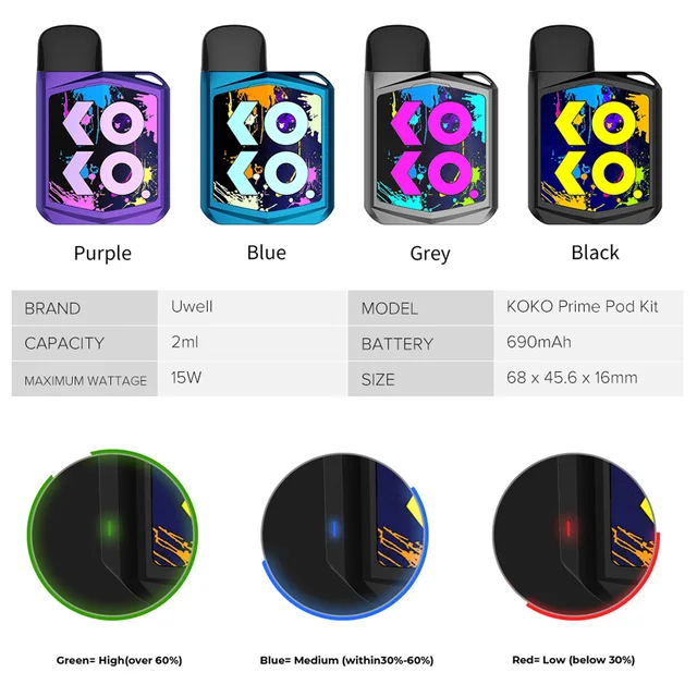 KOKO Prime Kit est un kit de système de remplissage supérieur qui est connu comme une version améliorée d’uwell KOKO. Il est compatible avec Caliburn G pod et bobines. Il existe 2 types de bobines: la bobine UN2 mesh-h 0.8ohm (slow séparément) et la bobine féral 1.0ohm (pré-installée). Les deux bobines atomisent uniformément et durent plus longtemps. Et avec la technologie exclusive brevetée de test de saveur pro-focs d’uwell, le KOKO Prime vous apporte une saveur pure et dense. En outre, il adopte une conception ingénieuse des voies respiratoires pour vous offrir 2 expériences de vapotage différentes lorsque le pod est installé dans différentes directions. Comme une vaporisation directe limitée aux poumons et une vaporisation bouche à poumon. De plus, il prend en charge des panneaux décoratifs magnétiques remplaçables pour ajouter plus de plaisir au produit, qui peut être facilement remplacé. Et pour libérer vos mains et vos poches, il est livré avec une lanière, un accessoire à la mode. Enfin, vous pouvez facilement connaître l’état de fonctionnement et les niveaux de batterie avec un voyant lumineux.