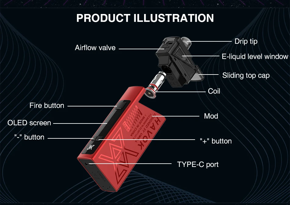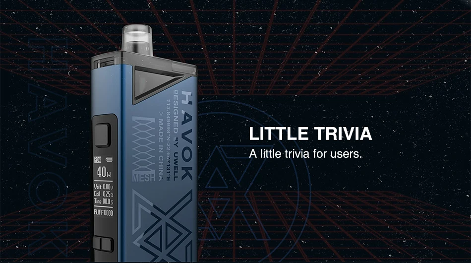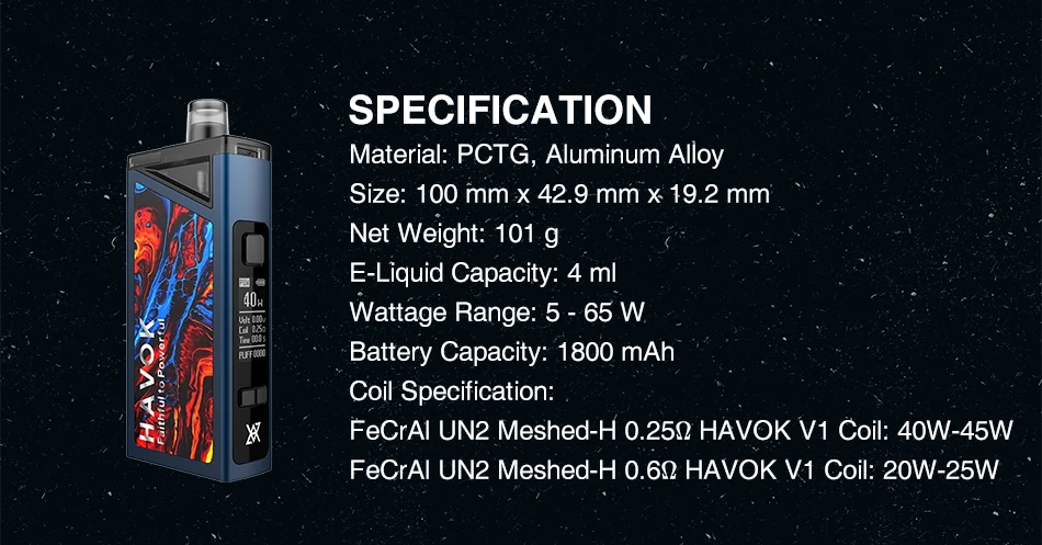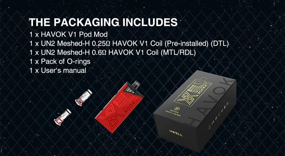 Uwell havoc V1 présente un système de dosettes impressionnant et beau qui convient aux MTL ainsi qu’aux DTL ou RDL, et répond donc à presque toutes les exigences. Le logo lisse et la surface mate sont exquis, bien sûr, il est confortable à tenir et se sent bien dans la main. Un panneau de style résine est intégré sur un côté de l’appareil. En plus du bouton d’alimentation standard et d’une paire de boutons de réglage sur le panneau de commande, un écran OLED de 0.96 pouces est ajouté pour un affichage clair de toutes les données. Le port de type-c amélioré est situé au bas de l’appareil. La capacité de la batterie de l’appareil est de 1800mAh avec une puissance maximale de 65W, c’est suffisant pour toute votre journée de vapotage et de chasse au nuage. Charge rapide à 5V/2A taux de charge élevé via le port type-c. Il n’y a pas d’activation de dessin dessus, il faut appuyer sur le bouton pour tirer. Avec un seul bouton de commande, cliquez rapidement sur le bouton de tir 5 fois pour allumer/éteindre l’appareil, sûr et fiable. Alimenté par un chipset intelligent, le havoc V1 peut détecter automatiquement la bobine installée et correspond à la puissance en conséquence pour améliorer la durée de vie de la bobine. La puce dispose de plusieurs fonctions de protection de circuit pour fournir des performances stables, sûres et fiables. En outre, havok-v1 est également livré avec un compteur de bouffantes et une fonction de verrouillage de l’appareil: le compteur de bouffantes enregistre votre utilisation quotidienne. Appuyez sur le bouton de tir et le bouton «-» en même temps pour verrouiller/déverrouiller l’appareil, empêcher l’opération accidentelle de causer une panne de l’équipement.