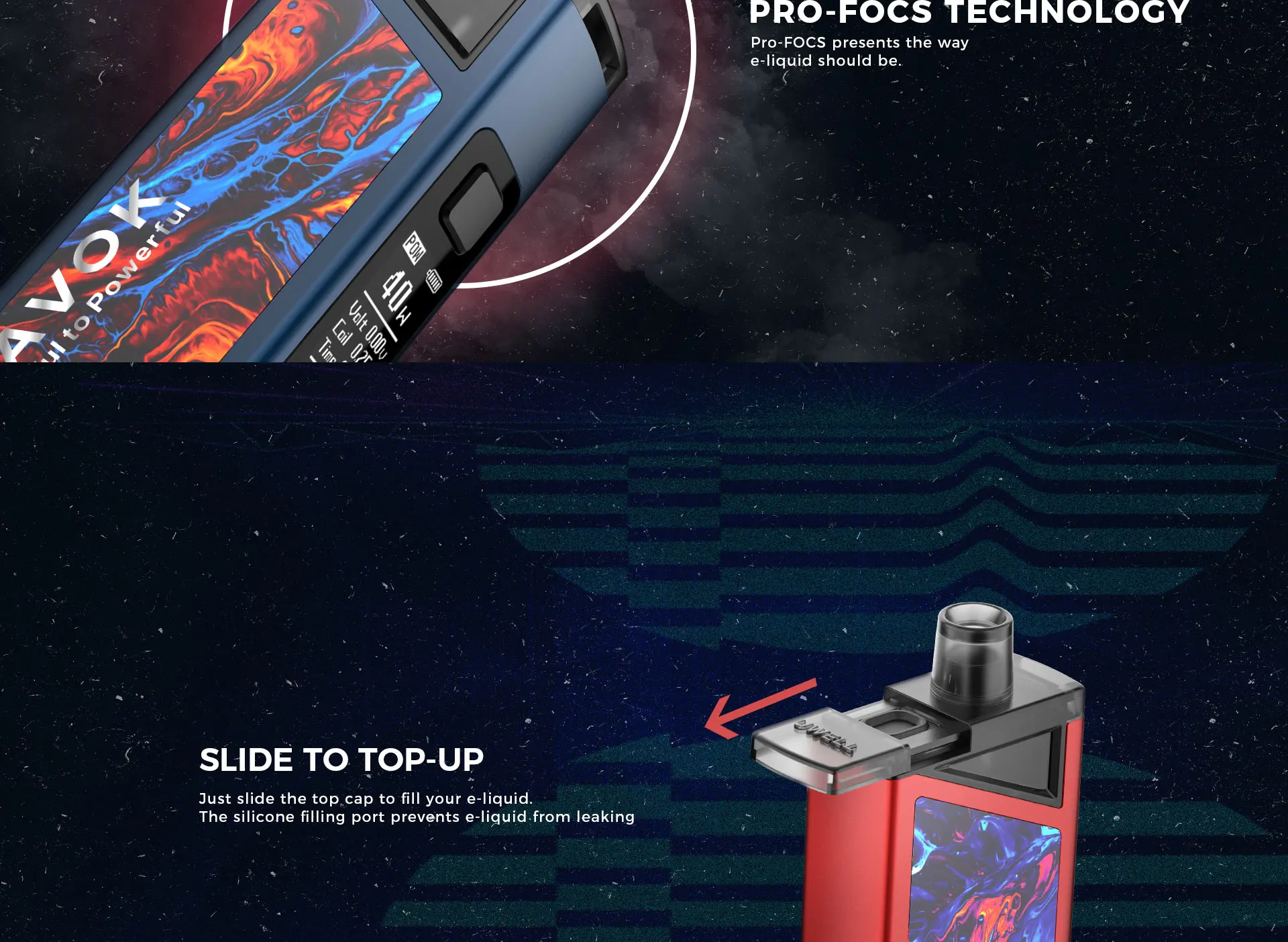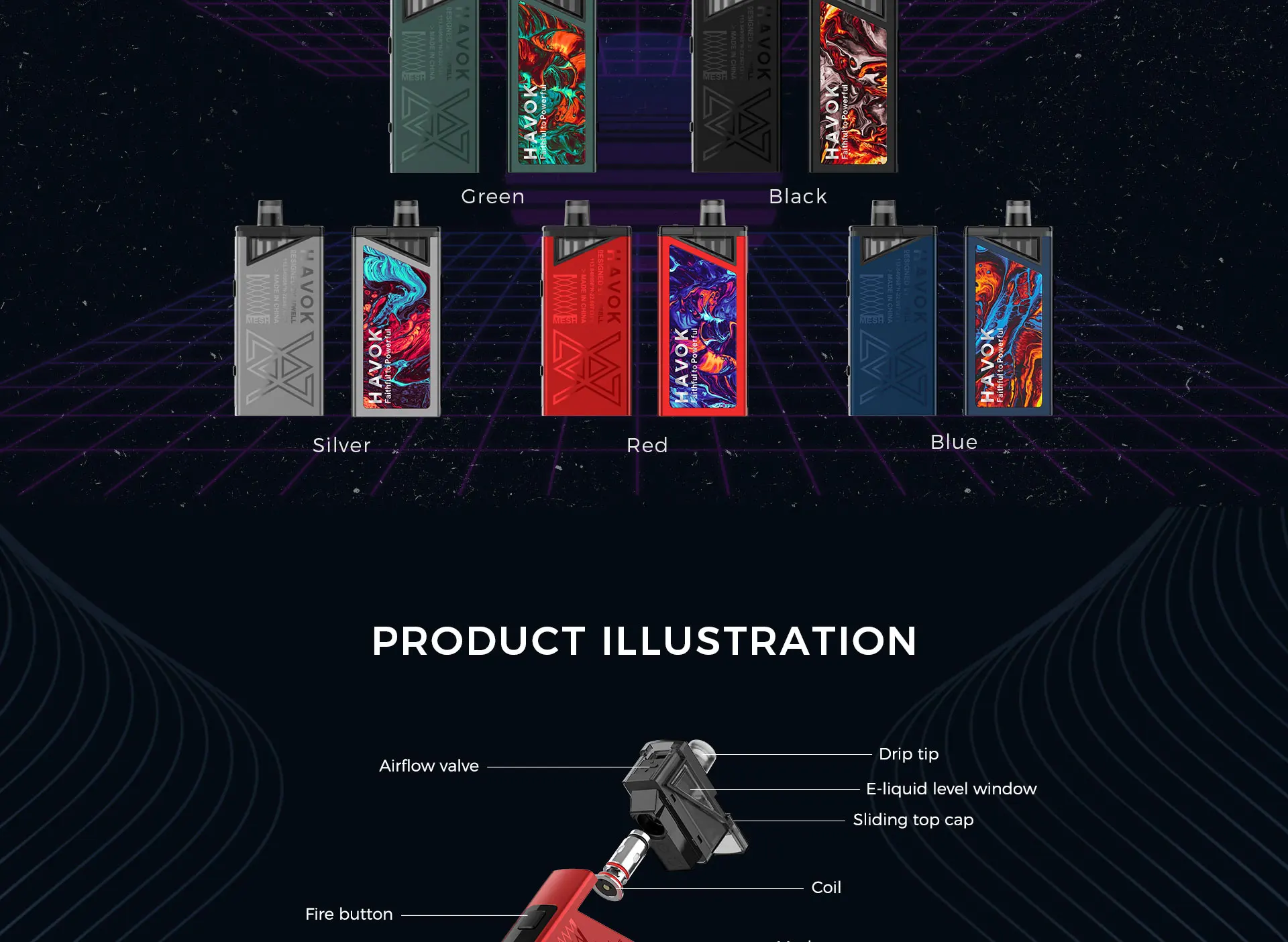 Havok V1 Kit est un kit pod mod doté de la technologie pro-focs. L’entrée du flux d’air est située sur le côté de la cartouche pour éviter les fuites. De plus, l’orifice de remplissage en silicone empêchera également e-liquide de fuir. C’est une combinaison de débit d’air et de sortie réglables, qui vous aident à obtenir une saveur personnelle. Il est facile, rapide et pratique pour vous de charger avec la conception de charge rapide USB type-c. La capacité de la batterie est de 1800mAh et la capacité du jus électronique est de 4ml.
