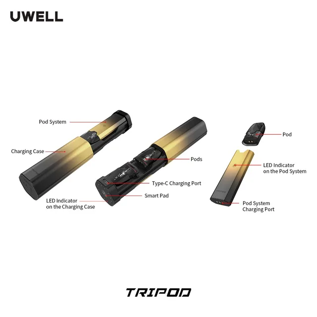 UWELL – trépied pour Cigarette électronique, Kit de dosettes, étui de charge 1000 mAh, batterie 370 mAh, 2ml, 1000 mAh