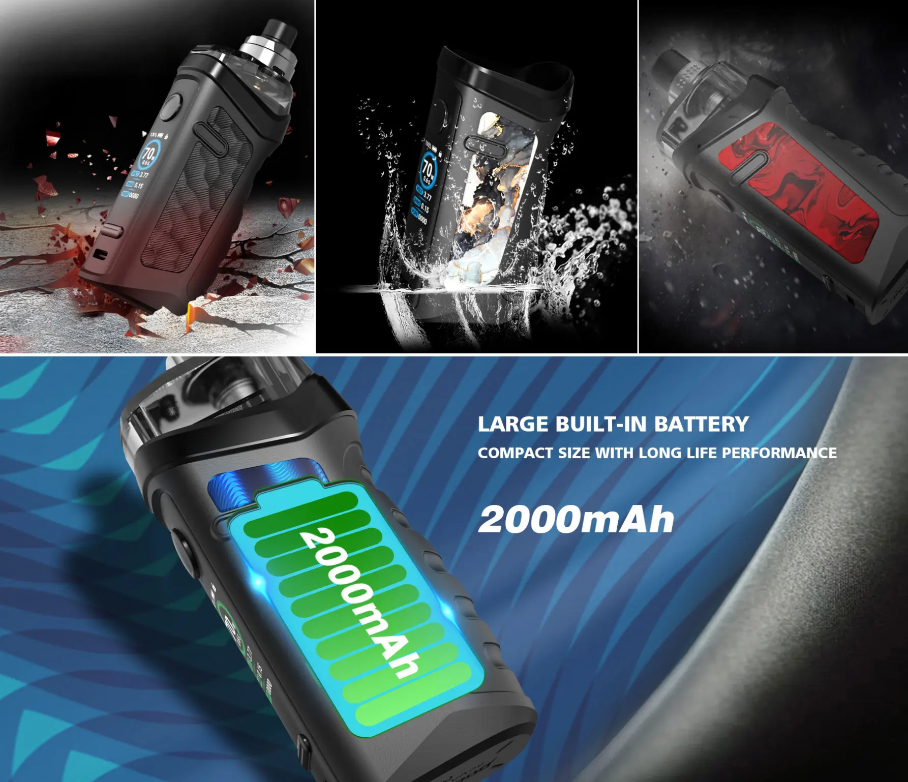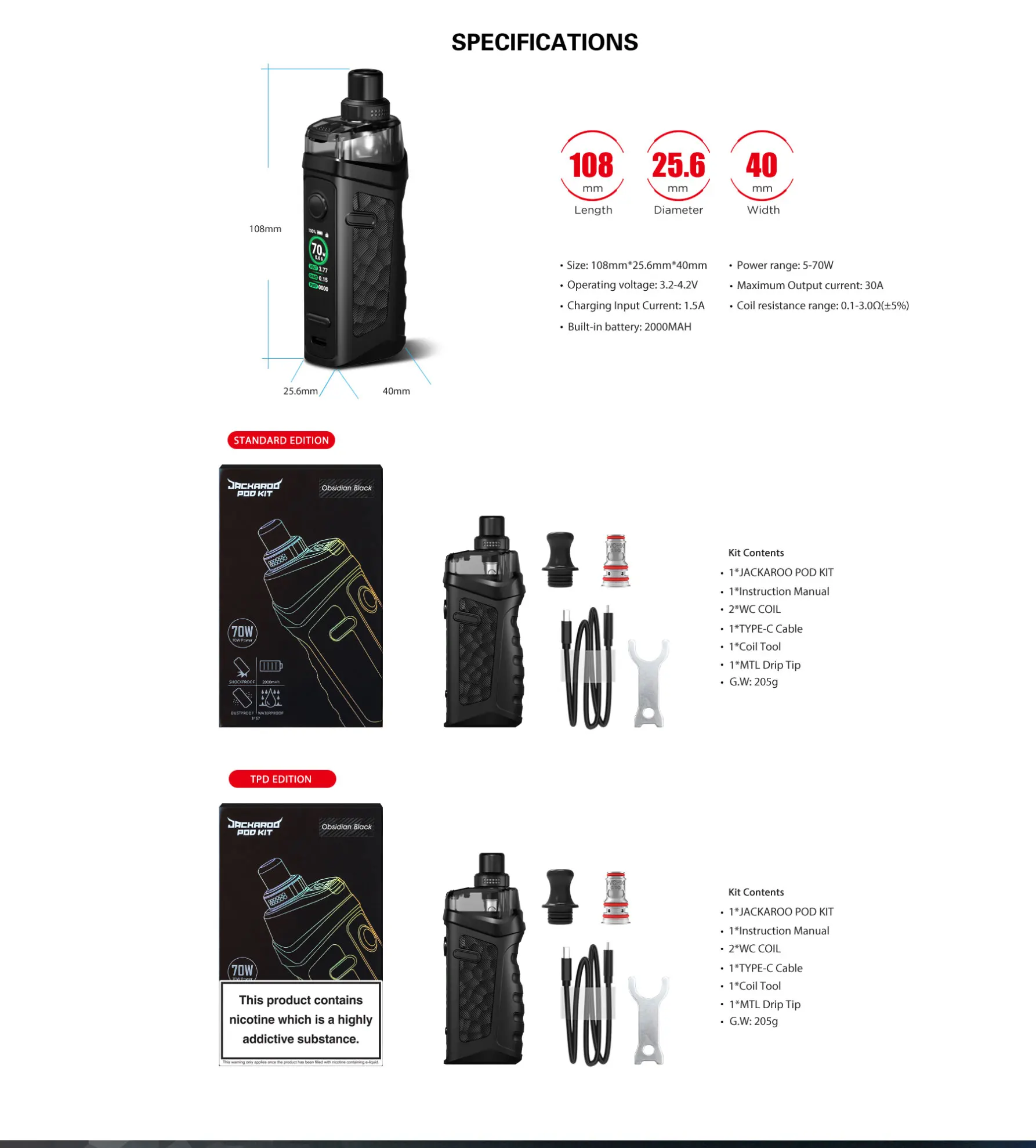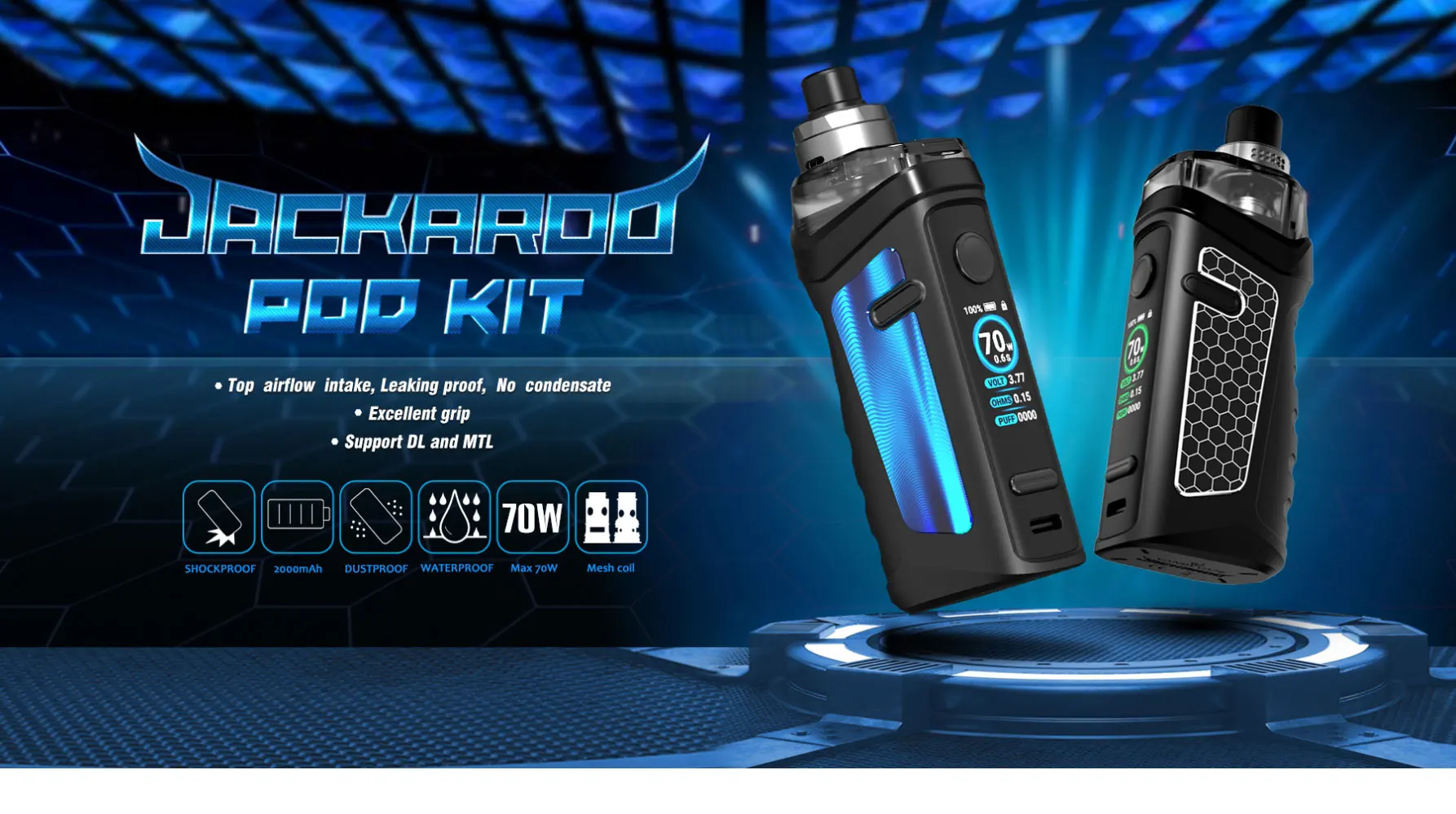 Le Kit de dosettes Jackaroo présente un design ergonomique pour une prise en main confortable. Avec une batterie intégrée de 2000mAh, vous pouvez charger rapidement via le port de charge étanche de Type C. La capacité de la batterie est en fait jusqu’à 2200mAh. Jackaroo Pod Mod Kit fournit un mécanisme étanche avec une conception de remplissage supérieure, il apporte plus de commodité et sans condensation. Jackaroo Pod adopte une puce de Vape Vandy améliorée, la puissance peut atteindre 70W. Le mod prend également en charge plus d’options de bobines de maille VVC de différentes résistances (0.15/0.3/0.6/0.9/1.2 ohm) pour offrir des choix de saveur plus larges et de meilleures performances gustatives. Vandy Vape Jackaroo Pod Kit peut répondre à tous vos besoins de vapotage DL/MTL.