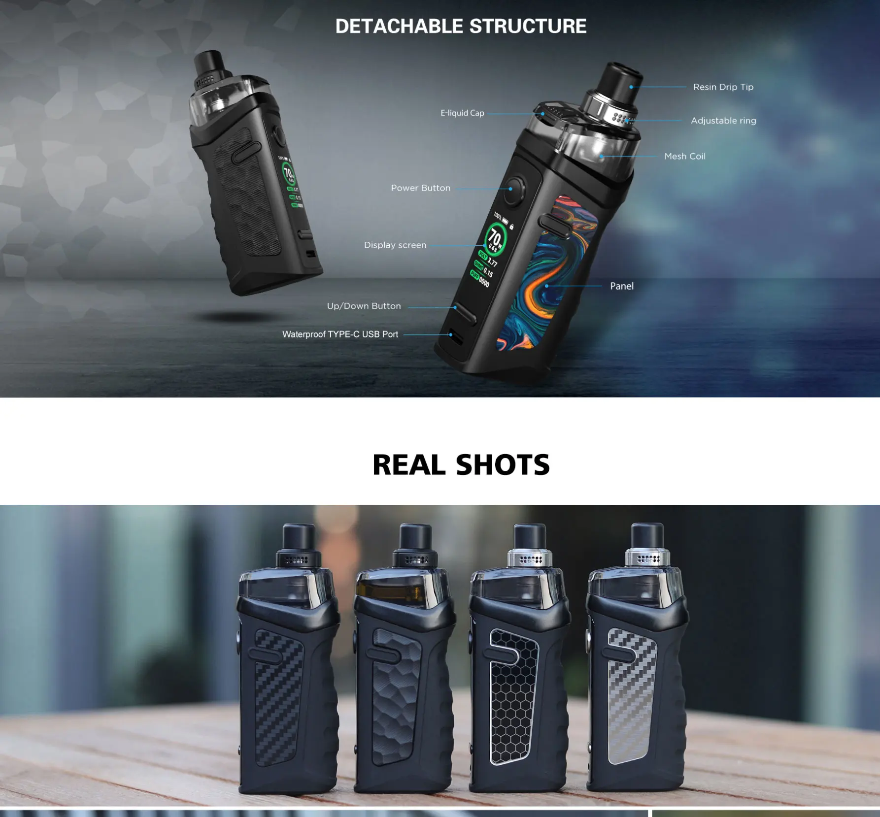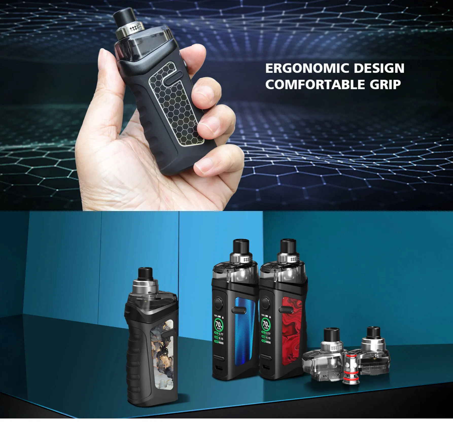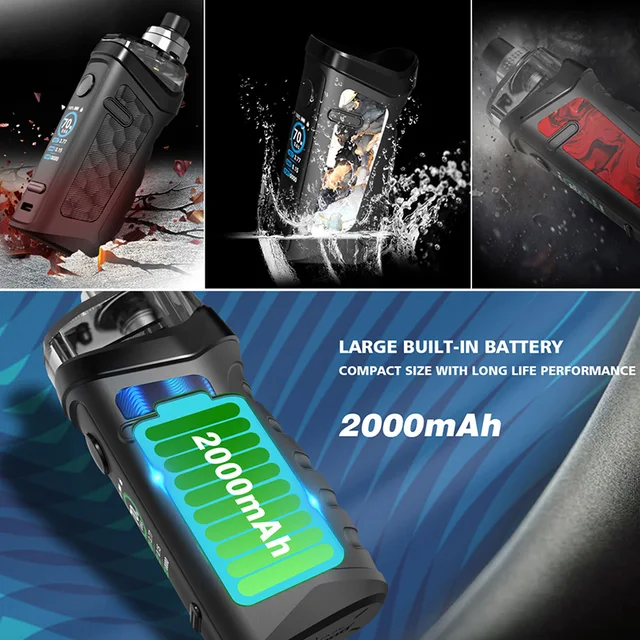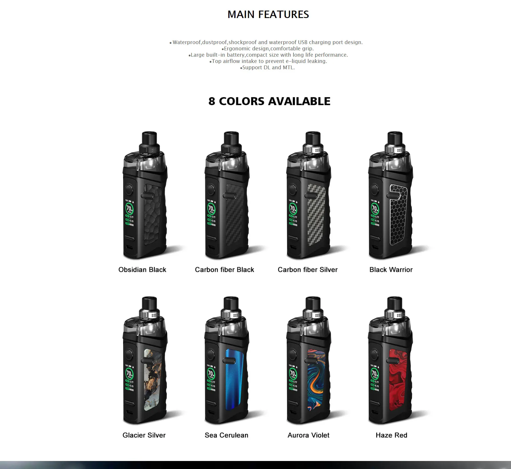 Le Kit de dosettes Jackaroo présente un design ergonomique pour une prise en main confortable. Avec une batterie intégrée de 2000mAh, vous pouvez charger rapidement via le port de charge étanche de Type C. La capacité de la batterie est en fait jusqu’à 2200mAh. Jackaroo Pod Mod Kit fournit un mécanisme étanche avec une conception de remplissage supérieure, il apporte plus de commodité et sans condensation. Jackaroo Pod adopte une puce de Vape Vandy améliorée, la puissance peut atteindre 70W. Le mod prend également en charge plus d’options de bobines de maille VVC de différentes résistances (0.15/0.3/0.6/0.9/1.2 ohm) pour offrir des choix de saveur plus larges et de meilleures performances gustatives. Vandy Vape Jackaroo Pod Kit peut répondre à tous vos besoins de vapotage DL/MTL.