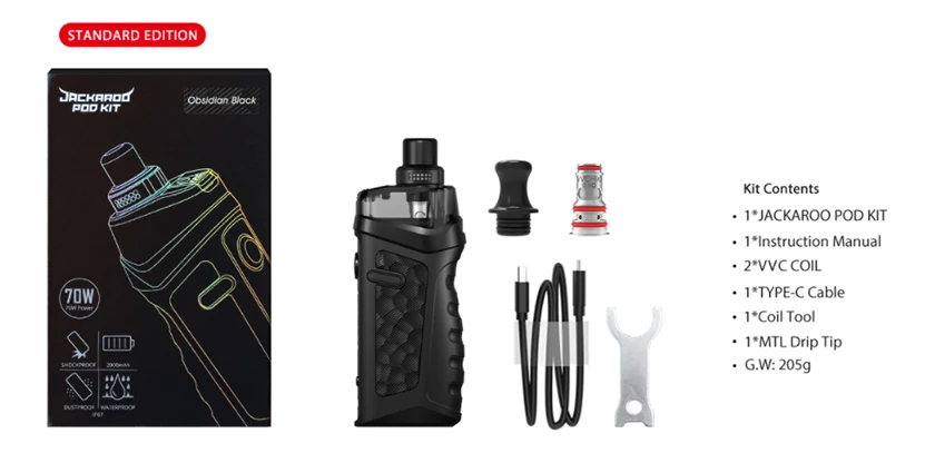 Vandy – cigarette électronique vapoteur Jackaroo, Kit Pod 70W, capacité de 4.5ml, Compatible avec les bobines de maille VVC, 2000mAh, chargement de Type C intégré