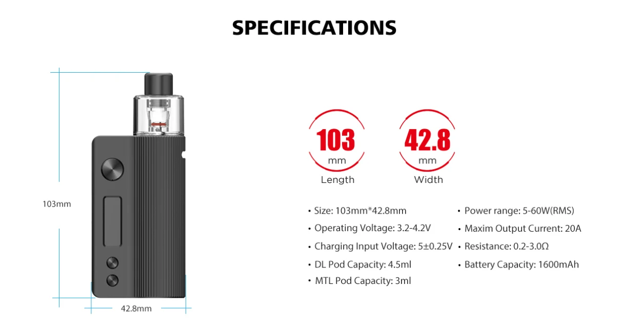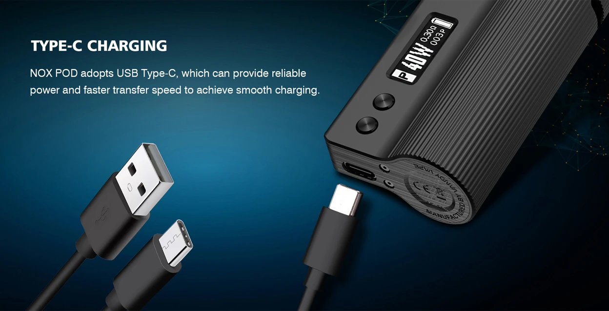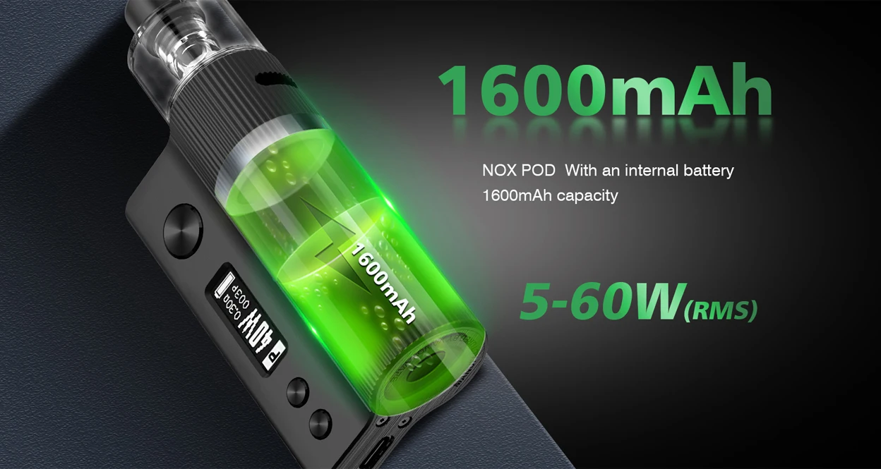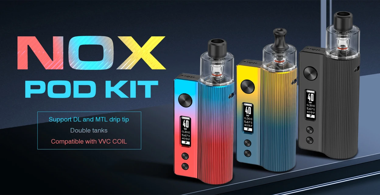 Vandy VapeNox Pod Kit est un kit de système de pod exquis, petit et durable. Le mod est construit avec une batterie de 1600mAh et peut tirer jusqu’à 60W max. La conception de charge USB type-c rend la charge rapide et pratique. Le Kit de dosettes Nox est livré avec deux dosettes: dosette DL de 4.5ml et dosette MTL de 3ml. Vous pouvez faire pivoter la cartouche pour ajuster le flux d’air de DL à MTL. Nox Pod est compatible avec les bobines VVC.