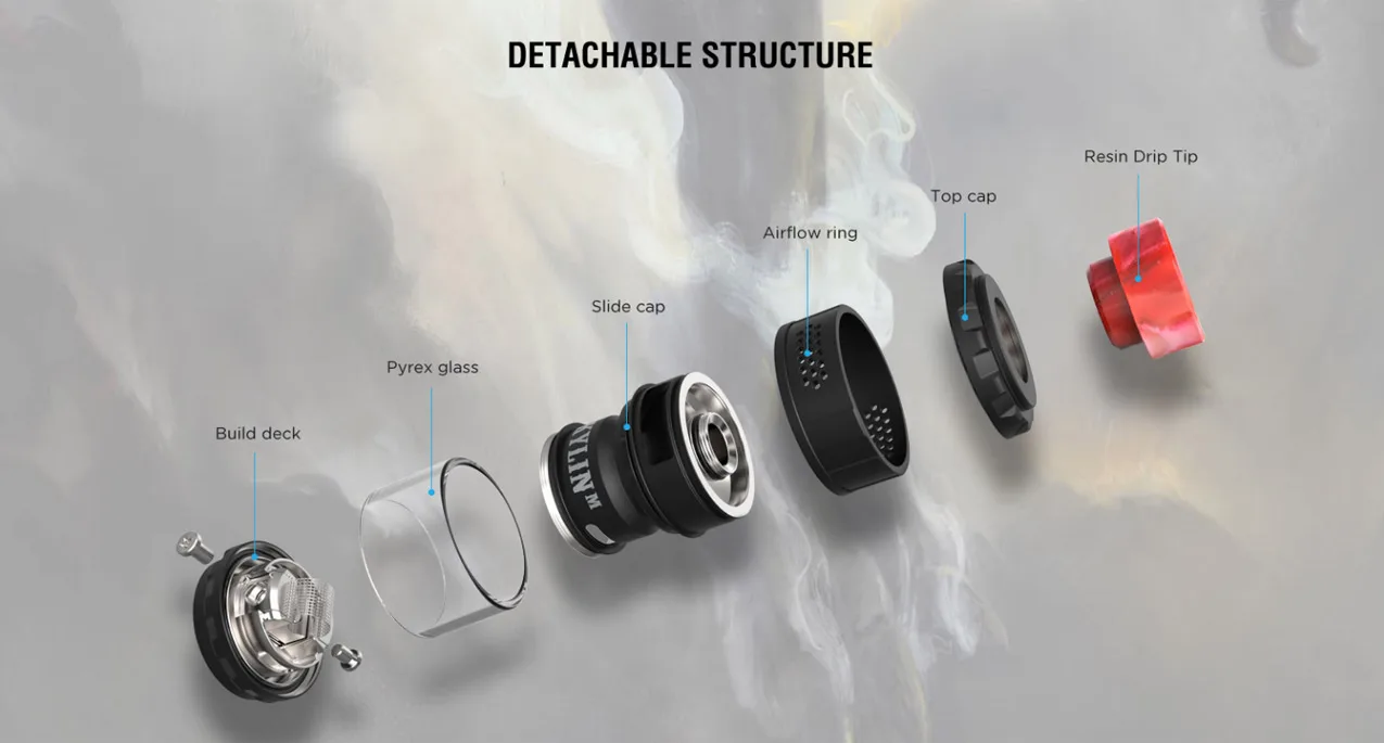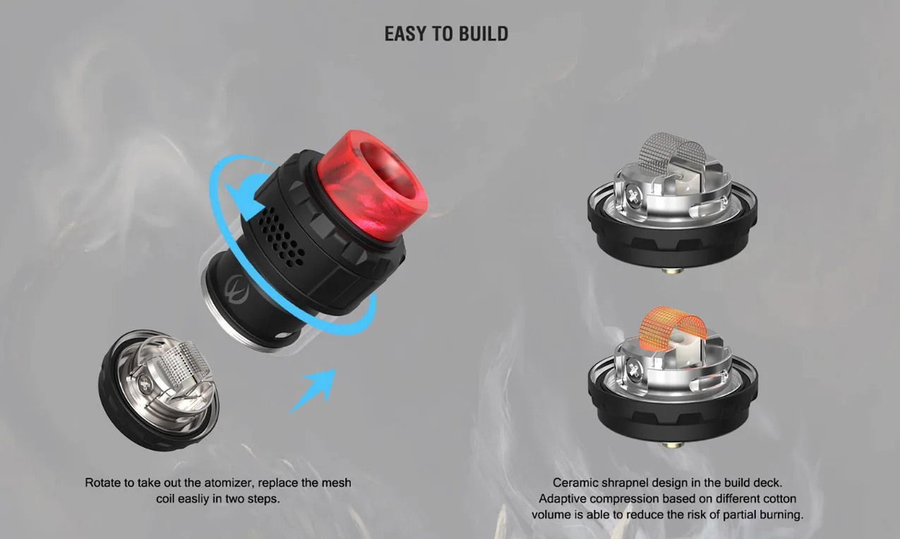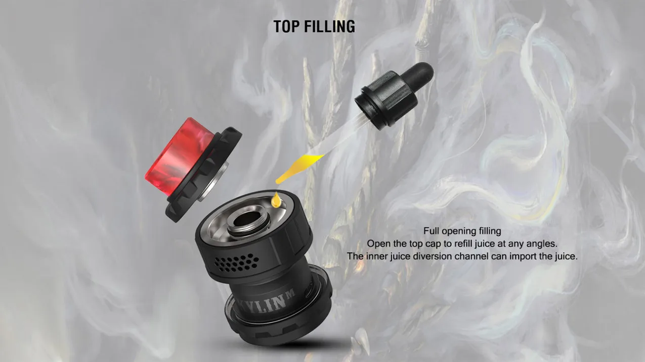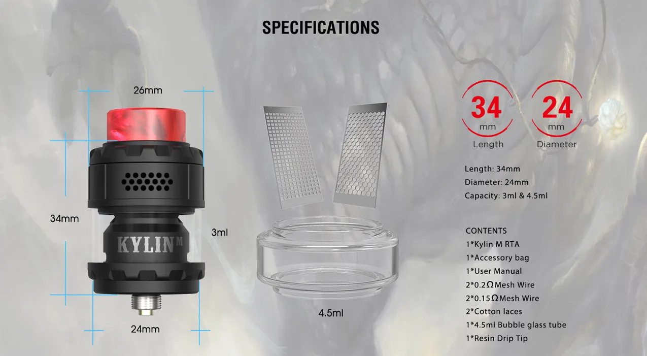 Le Kylin M RTA par Vandy Vape Est une RTA de maille qui est un peu semblable à la RDA de profil. Il mesure 34mm (L) x 24mm (D). La capacité avec le verre régulier est de 3ml, et 4.5mL avec le verre à bulles qui est inclus. À partir de la libération, ils sont 2 Options de bobine de maille; 0.15 ohm et 0.2 ohm. Les bobines de maille de 0.15 ohms ont une puissance recommandée de 50W – 70W. Les bobines de maille de 0.2 ohms ont une puissance recommandée de 40W – 60W. Le RTA a un flux d’air en nid d’abeille, est rempli par le haut et très facile à construire.