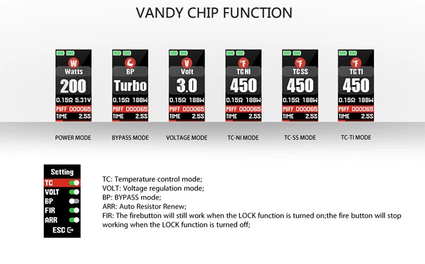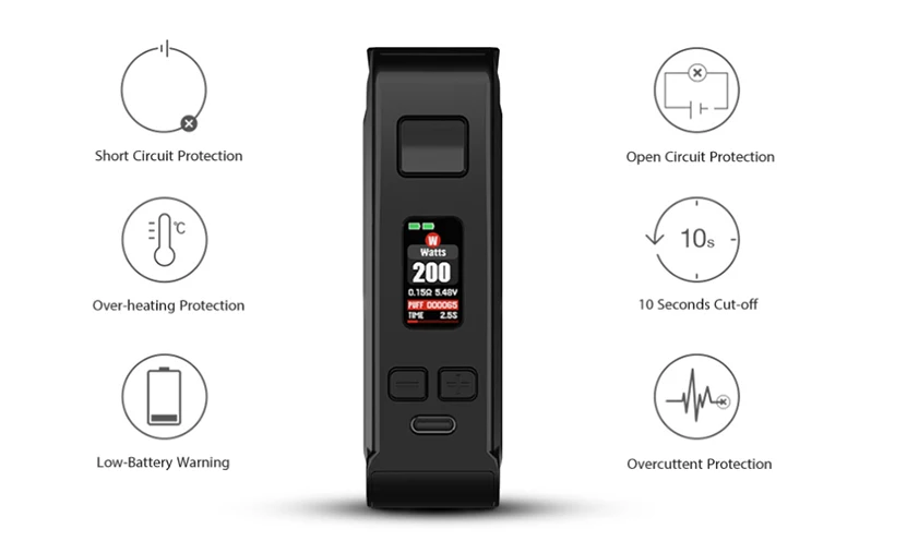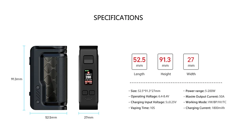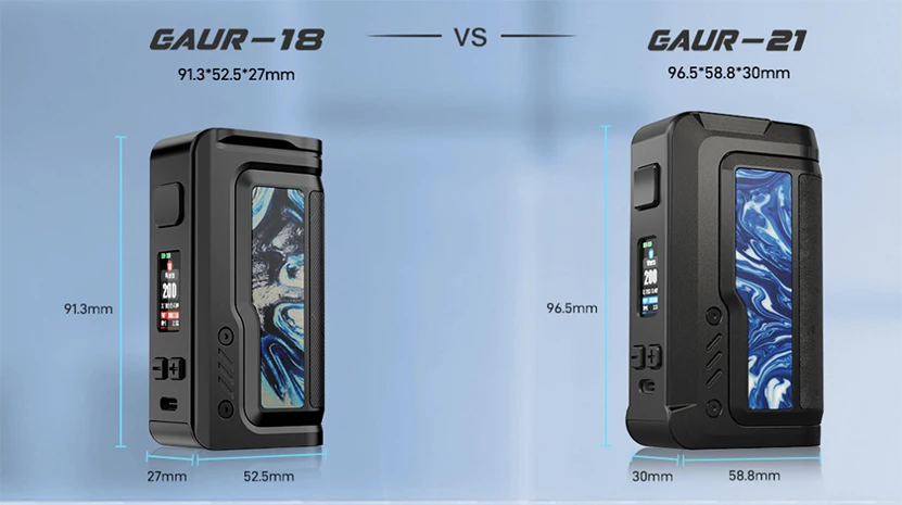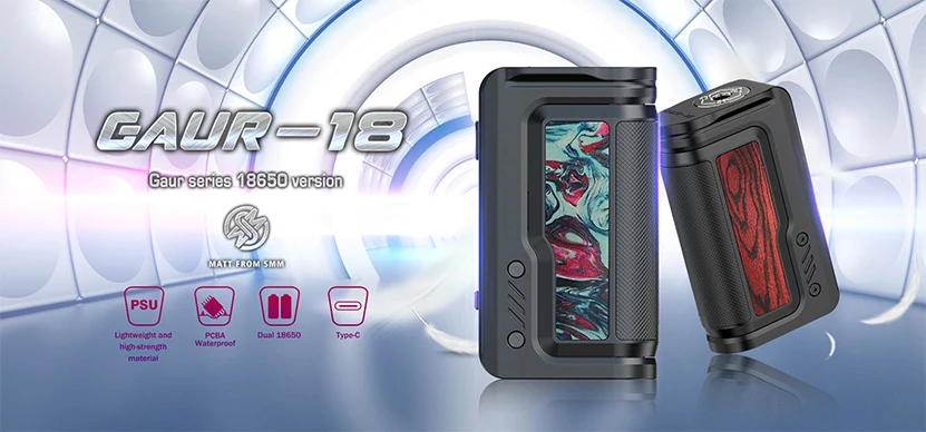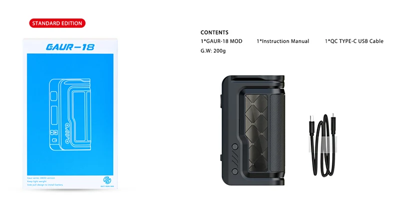Gaur-18 Mod dispose d’un matériau léger et très résistant. Avec le PCBA étanche, il est facile d’éliminer les taches et la poussière. Alimenté par une puce vandale améliorée avec 200W max, il dispose d’un mode de fonctionnement VW/BP/VV/TC pour répondre à vos différents besoins et de multiples protections pour garantir une utilisation sûre du Mod. Gaur-18 Mod est compatible avec deux batteries externes 18650 avec chargement de Type C. Il a également la conception de traction latérale pour installer la batterie.
