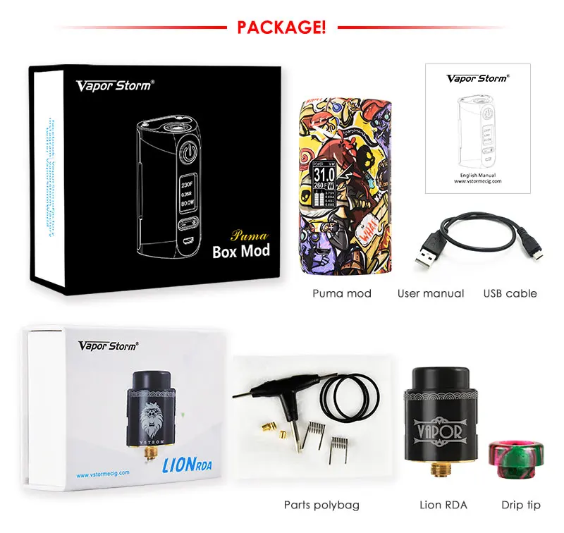 Kit Vapor Storm Puma, qui est avec un MOD TC Box léger et puissant avec un corps graffiti unique et une sensation de main confortable. Alimenté par deux batteries 18650, le Puma MOD émet une puissance maximale de 200W avec différents modes de fonctionnement. Avec la puce stable et avancée, le Puma vous apportera un feu plus rapide et une meilleure saveur de bobine. En Plus de la conception antichute et anti-rayures, le MOD de tempête de vapeur est certainement un dispositif de vapotage durable et excellent.