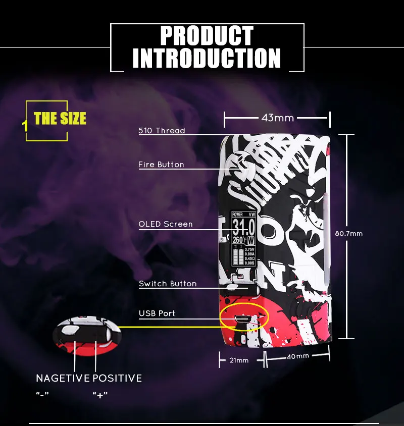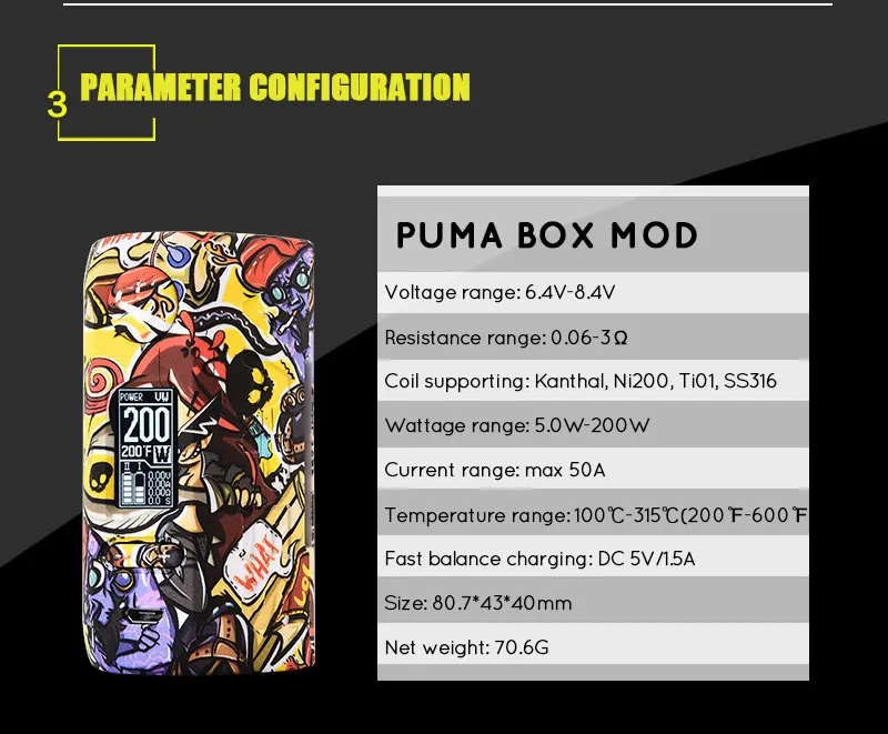 Kit Vapor Storm Puma, qui est avec un MOD TC Box léger et puissant avec un corps graffiti unique et une sensation de main confortable. Alimenté par deux batteries 18650, le Puma MOD émet une puissance maximale de 200W avec différents modes de fonctionnement. Avec la puce stable et avancée, le Puma vous apportera un feu plus rapide et une meilleure saveur de bobine. En Plus de la conception antichute et anti-rayures, le MOD de tempête de vapeur est certainement un dispositif de vapotage durable et excellent.