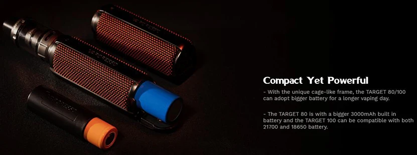 Le Mod Target 100 prend en charge une seule cellule 21700/18650. C’est le premier à utiliser des tissus tressés résistants à l’eau pour rendre la cible 100 plus durable pour une utilisation en extérieur et confortable à tenir. Doté d’un cadre unique en forme de cage, il est durable et stable. La puce AXON est appliquée pour fournir un contrôle précis du taux de chauffage et la vaporisation complète de différentes saveurs à différentes températures. Il peut être chargé via le port de charge DC 5V/2A type-c.