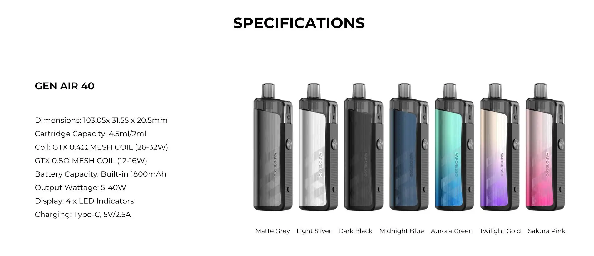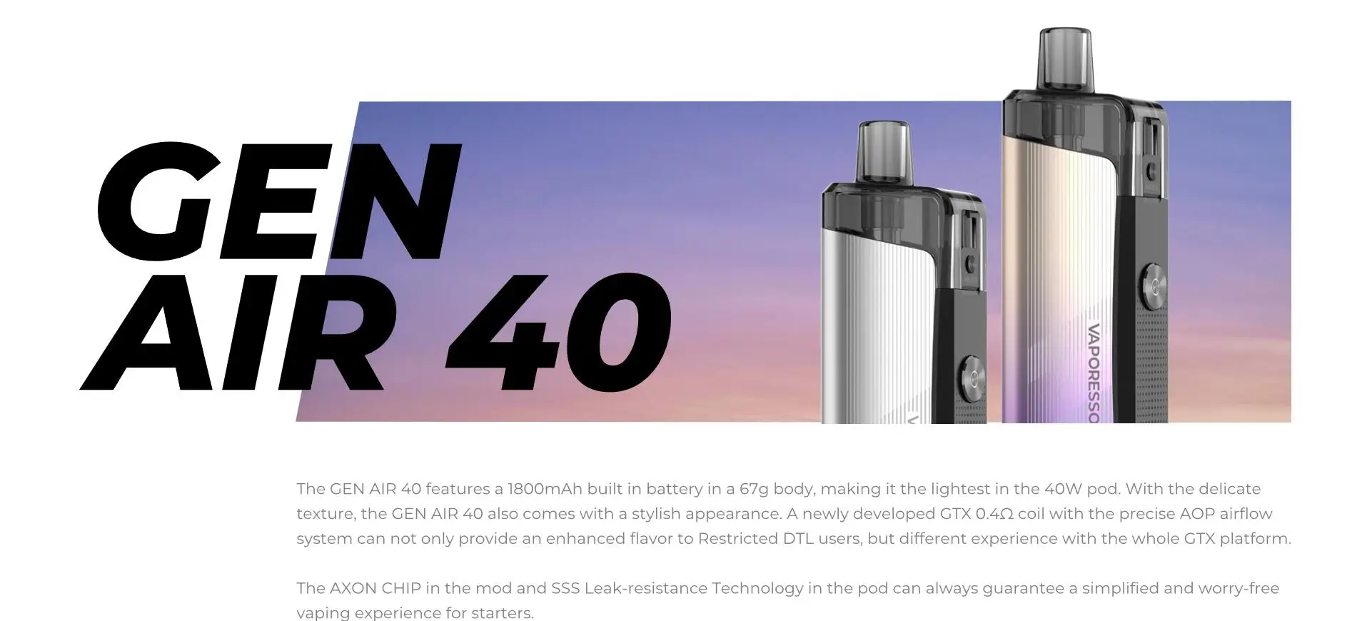 Vaporesso GEN AIR 40 Kit modifie le système de flux d’air AOP (débit d’air réglable sur Pod) pour réduire la perte de flux d’air pour les vapeurs RDL. Il contient un e-liquide de 4.5ml et est compatible avec toute la plate-forme GTL qui permet la résistance de la bobine entre 0,2ohm et 1,2ohm, les GTX 0,4ohm et 0,8ohm sont préparés. Alimenté par une batterie interne de 1800mAh, vous pouvez régler la puissance pour atteindre jusqu’à 40W. Livré avec la technologie de résistance aux fuites SSS, il scelle complètement et stocke en toute sécurité pour les e-jus freebase et nic sel, qui est rempli via un système de remplissage latéral. Il est polyvalent grâce à sa puce AXON, il dispose d’un indicateur de batterie de stockage et d’un réglage précis de la puissance.