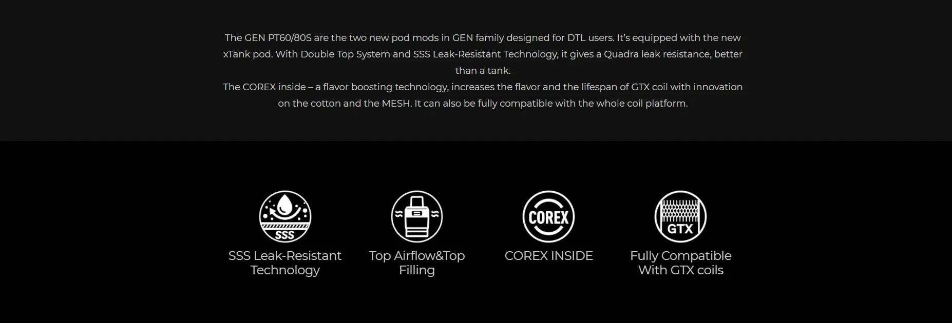 Le Kit GEN PT60 est un mod de dosette nouvellement conçu pour les utilisateurs DTL. Il est alimenté par une batterie intégrée de 2500mAh avec une sortie de 5-60W et une charge de type-c. Équipé du réservoir x pod d’une capacité de 4.5ml, il dispose d’un remplissage par le haut et d’un flux d’air par le haut pour une meilleure expérience et un fonctionnement plus simple. Combiné à la technologie de résistance aux fuites SSS 2.0 et au système d’auto-circulation liquide, il est plus sûr que jamais. Le Kit vaporéso GEN PT80 S convient à toutes les bobines GTX. Le COREX nouvellement innovant à l’intérieur du Kit peut vous apporter une saveur plus dense et une durée de vie plus longue de la bobine GTX. Avec la structure brevetée de Morph-Mesh, il peut assurer un chauffage plus uniforme et une augmentation plus forte de saveur. De plus, l’utilisation de bidon de coton cumulus moelleux garantit une plus grande livraison de liquide et vous apporte un plaisir plus constant et plus long. La GEN PT60 est légère, élégante et intelligente. Le mode intelligent reconnaîtra et recommandera automatiquement la meilleure puissance en watts pour devenir plus simple à utiliser pour les vapoteurs DTL.