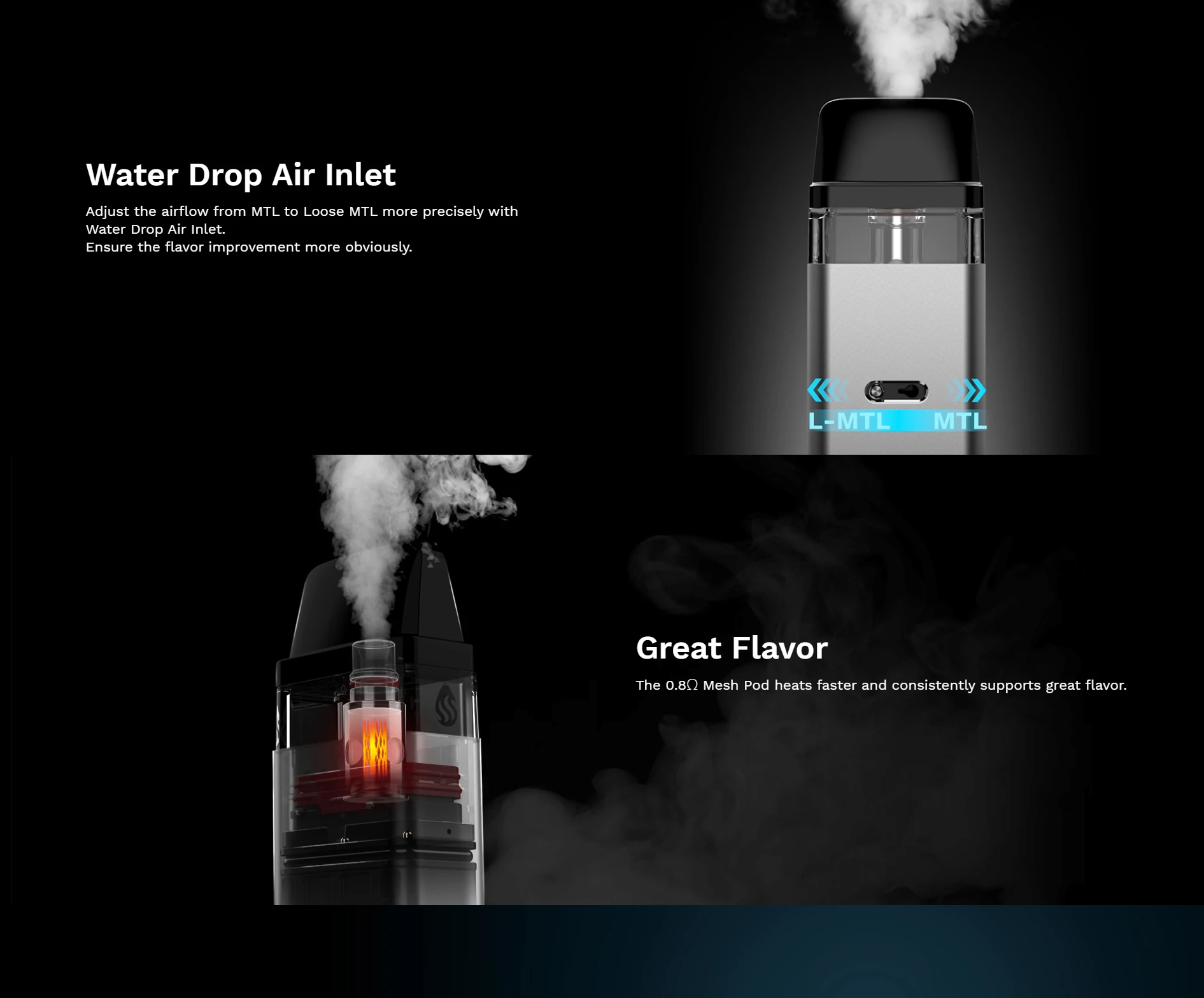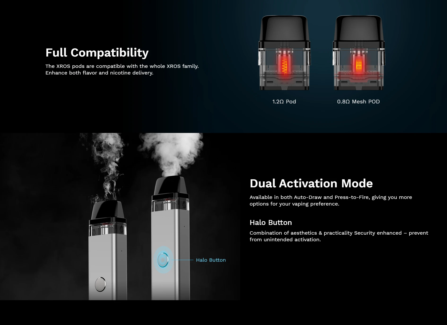 XROS 2 Kit est le nouveau nombre de produits de la série XROS, c’est un kit système pod qui va franchir les limites. Il dispose d’un débit d’air réglable avec l’entrée d’air de goutte d’eau améliorée et vous pouvez profiter d’une expérience de vapotage différente de MTL à MTL en vrac plus précisément. XROS 2 est également compatible avec les dosettes de la série XROS (dosette 1.2ohm 2ml, dosette 0.8ohm 2ml), et la nouvelle dosette de maille 0.8ohm peut chauffer plus rapidement et supporter une grande saveur de manière constante. De plus, la technologie SSS résistante aux fuites verrouillera fermement l’e-jus à l’intérieur et évitera les fuites en désordre. La conception du bouton halo vous aidera à éviter une activation involontaire. Il existe des modes activés par bouton et activés par tirage que vous pouvez choisir. XROS 2 a une capacité de batterie de 1000mAh pour vous fournir un vapotage durable, vous pouvez voir le niveau de batterie en temps réel avec l’indicateur de batterie tiding.