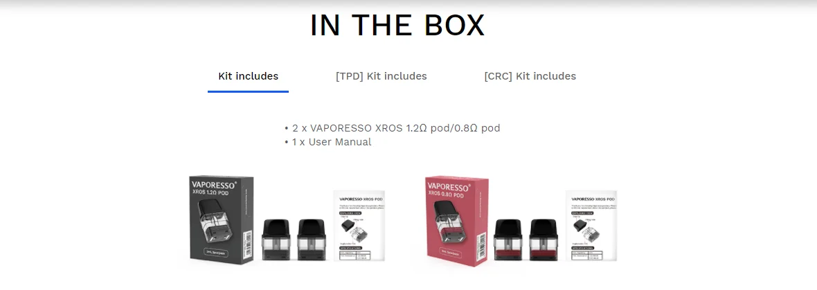 La cartouche XROS Pod est spécialement conçue pour le Kit Vaporesso XROS Pod. Il peut contenir une capacité de 2ml de jus électronique pour la vaporisation quotidienne. Et il est livré avec un système de remplissage supérieur et une conception de fenêtre visible pour vous apporter une grande commodité. En outre, il adopte une bascule de flux d’air réglable qui maximise l’efficacité de la saveur et la satisfaction de la nicotine pour couvrir vos besoins. Et il existe 2 types de dosettes en maille disponibles: dosette en maille de 1,2 ohm et dosette en maille de 0,8 ohm. Voici maintenant le nouveau Pod en maille de 1,2 ohm qui est ajouté avec un design résistant aux fuites pour fournir une meilleure saveur et le nouveau Pod en maille de 0,8 ohm qui chauffe plus rapidement et supporte une excellente saveur de manière constante. 2 pièces ou 4 pièces par paquet