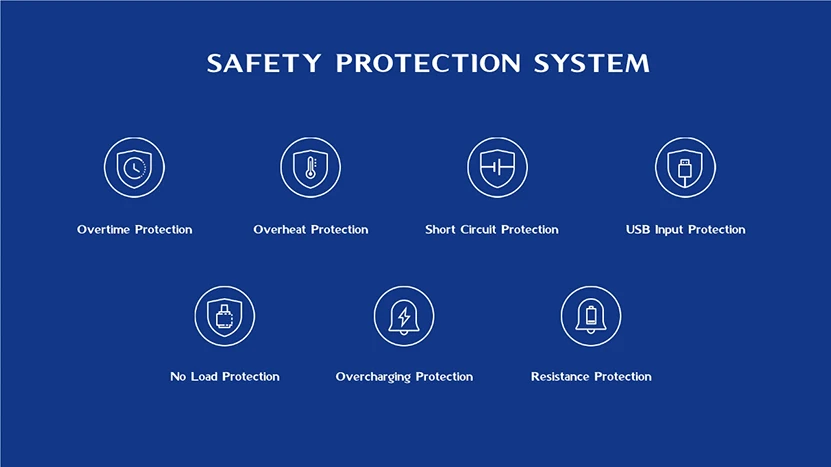 8. Plusieurs protections, comme la Protection contre les heures supplémentaires, la Protection contre la surchauffe, la Protection contre les courts-circuits, la Protection d’entrée USB, la Protection sans charge, la Protection contre la surcharge et la Protection contre la résistance