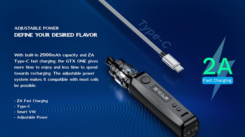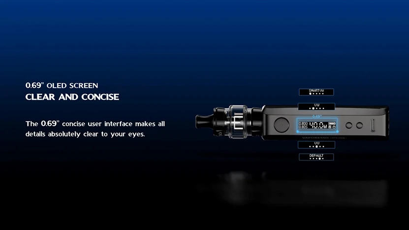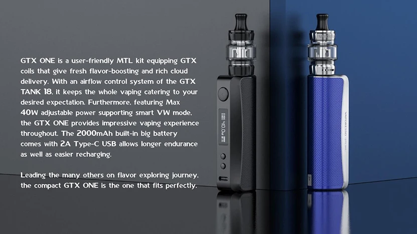 GTX ONE Kit est un kit mod VW qui est livré avec à la fois esthétique et ergonomique. Avec une taille compacte et un matériau durable, il offre une sensation de main confortable avec antidérapant et anti-rayures. Il se compose d’un grand réservoir de 3ml et d’une batterie intégrée de 2000mAh. Quant au réservoir, il adopte un système de remplissage supérieur pour un fonctionnement pratique et une conception de flux d’air réglable pour un flux d’air fluide. Et il est compatible avec les bobines GTX pour une saveur pure et un nuage dense. Avec tant de designs, il vous permet d’obtenir une merveilleuse expérience de vapotage MTL ou DTL limité. En outre, concernant le mod, il est livré avec une puissance de sortie réglable de 40W maximum et prend en charge le mode VW intelligent. Et équipé d’un écran OLED simple et concis de 0.69 pouces, il vous apporte tous les détails clairement. Enfin, il est conçu avec de multiples protections, telles que la Protection contre les heures supplémentaires, la Protection contre la surchauffe, la Protection contre les courts-circuits, la Protection d’entrée USB, la Protection sans charge, la Protection contre la surcharge, la Protection contre la résistance, et ainsi de suite.