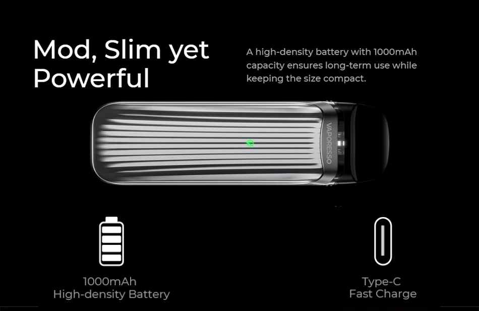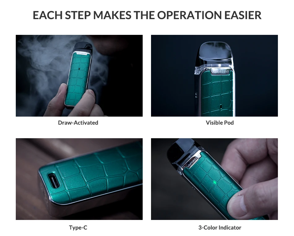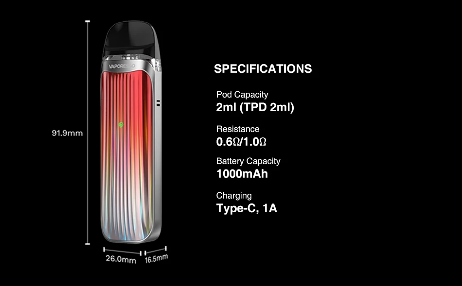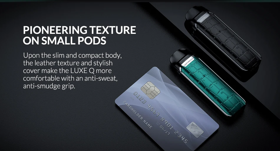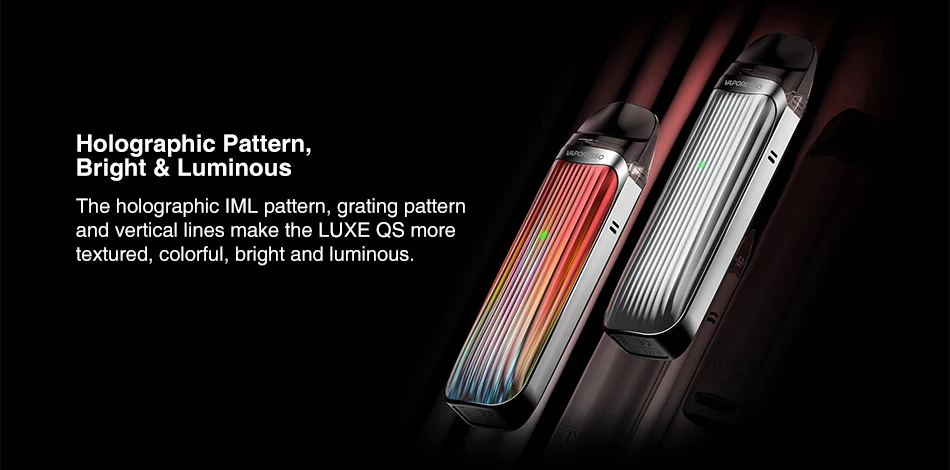 Vaporéso LUXE QS Kit est une version améliorée de LUXE Q, conçu pour les vapoteurs RDL qui chasse pour de bons coups de fil, il utilise à la fois un flux d’air libre et serré en commutant la cosse pour l’expérience de vapotage différente. La surface texturée présente un motif holographique IML et des lignes verticales. Il est alimenté par une batterie intégrée de 1000mAh et est compatible avec toutes les cosses Q de LUXE, les cosses en maille 0.6ohm et 0.80hm sont pré-installées pour une capacité de 2ml. Il y a un bouton non-utilisation-réglable, il vous donne la vapotage libre et vous pouvez choisir votre sel nic préféré et e-jus freebase.