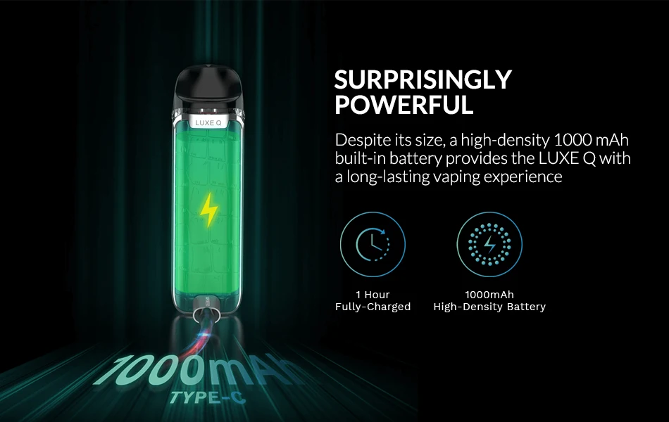 Le LUXE Q Kit est alimenté par une batterie intégrée de 1000mAh et est plus confortable à vape avec une texture en cuir et une couverture élégante. De plus, il est également livré avec une poignée anti-transpiration et anti-taches. Le Kit Q de LUXE adopte une dosette en maille de 0,8ohm et une dosette en maille de 1,2ohm pour vous fournir une saveur pure à chaque souffle. Il dispose d’un flux d’air réglable pour des saveurs intenses et satisfaisantes. La dosette est une dosette visible qui peut contenir 2ml de capacité e-jus. Le système de remplissage supérieur facilite le remplissage. Plus important encore, il dispose de la technologie de résistance aux fuites SSS (sceller complètement, saturer correctement, stocker en toute sécurité) pour apporter une expérience de liquide anti-fuite complète, ce qui vous aidera à obtenir un grand plaisir de vapotage. Une alimentation Stable sera fournie avec un câble USB type-c.