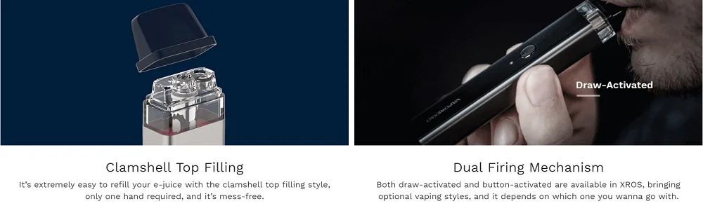 Le remplissage à une seule main avec un pod visible améliore toute votre expérience, en particulier avec la capacité de vapoter en tirant automatiquement ou en appuyant sur le tir avec le mécanisme de double tir.
