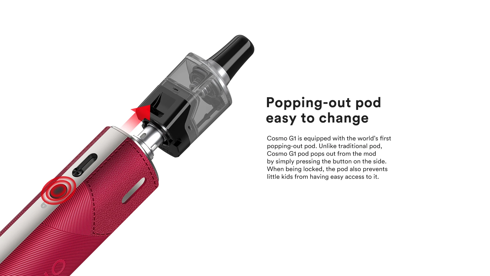 Cosmo G1 est équipé du premier pod pop-out au monde. Contrairement au pod traditionnel, Cosmo G1 pod sort du mod en appuyant simplement sur le bouton sur le côté. Lorsqu’il est verrouillé, le pod empêche également les petits enfants d’y accéder facilement.