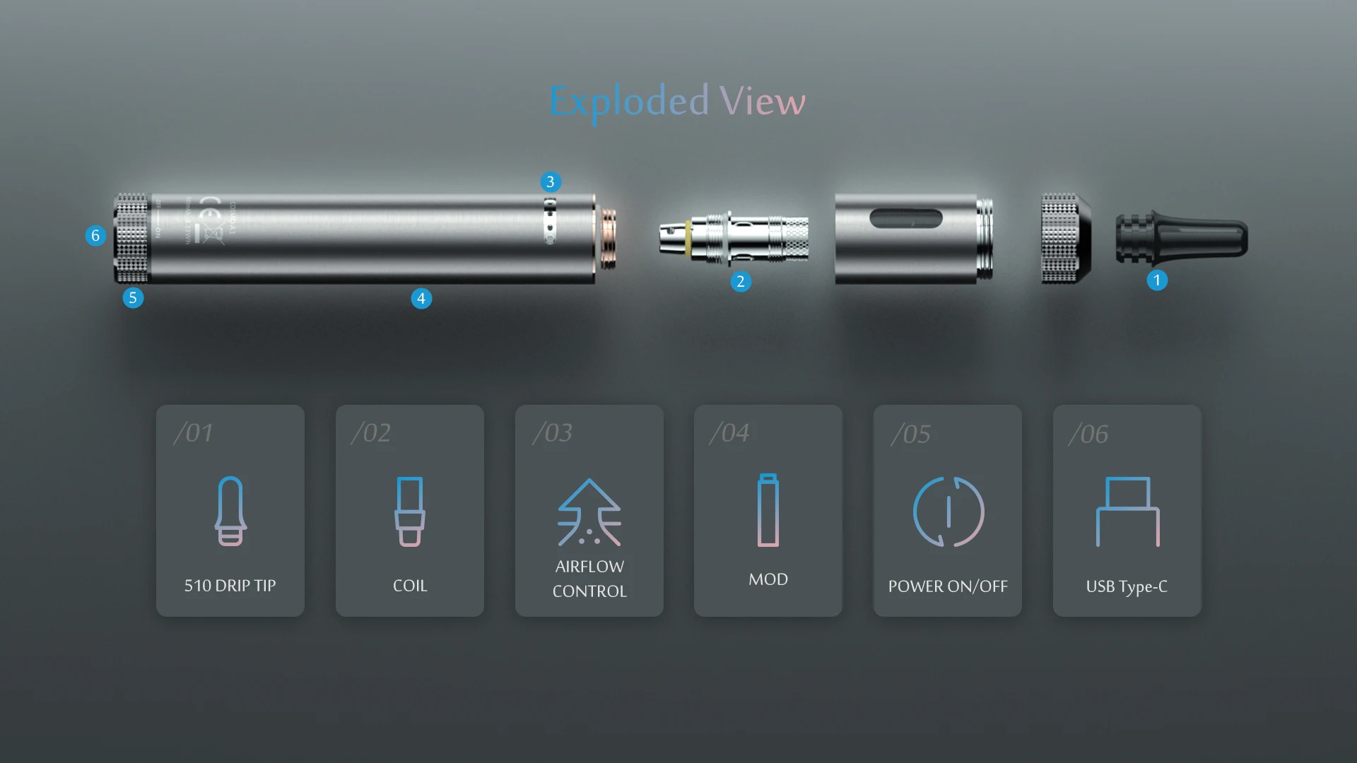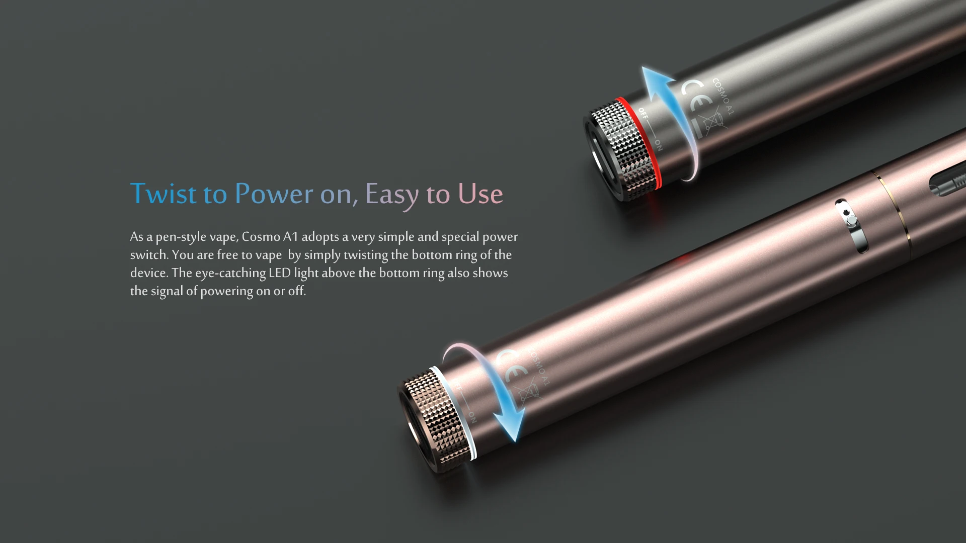 En tant que vape de style stylo, Cosmo A1 adopte un interrupteur d’alimentation très simple et spécial. Vous êtes libre de vapoter en tournant simplement l’anneau inférieur de l’appareil. La lumière LED accrocheuse au-dessus de l’anneau inférieur affiche également le signal de mise sous ou hors tension.