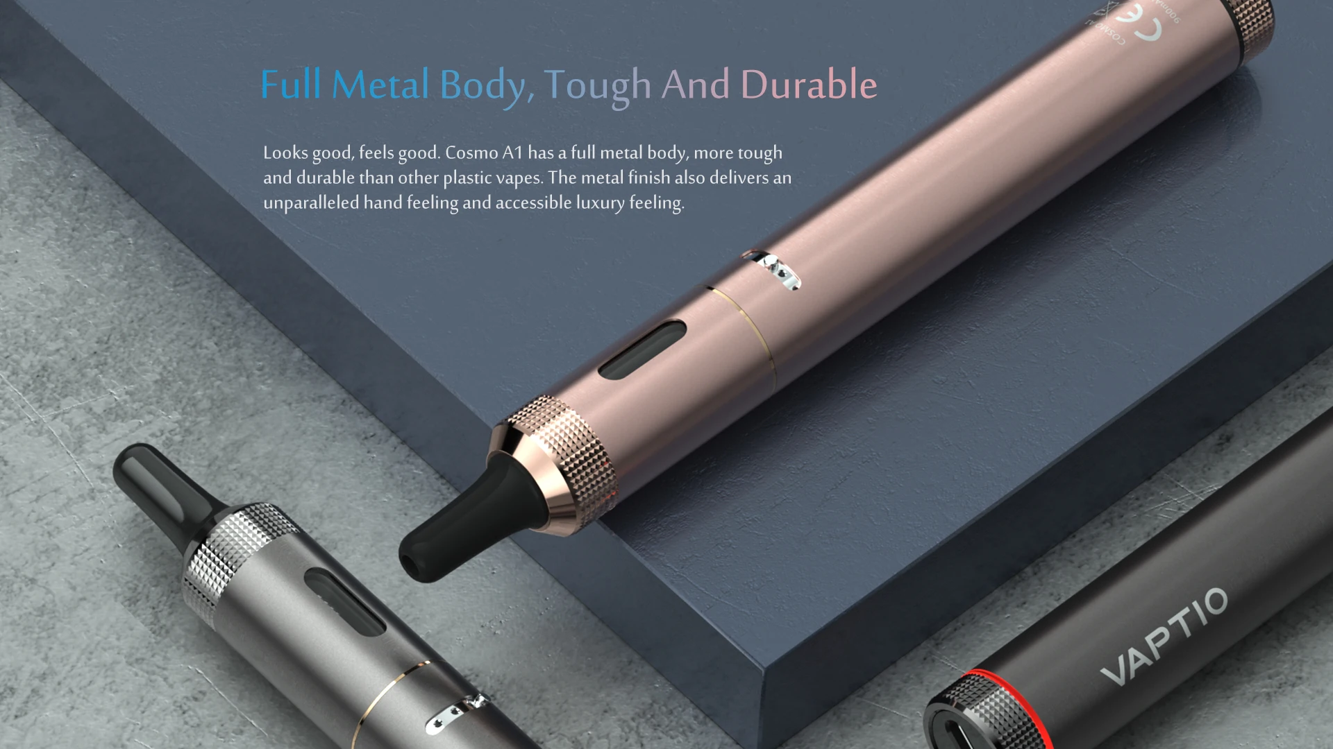 Semble de bonne qualité, se sent bien. Cosmo A1 a un corps entièrement métallique, plus résistant et durable que les autres vapeurs de plastique. La finition métallique offre également une sensation de main incomparable et une sensation de luxe accessible.