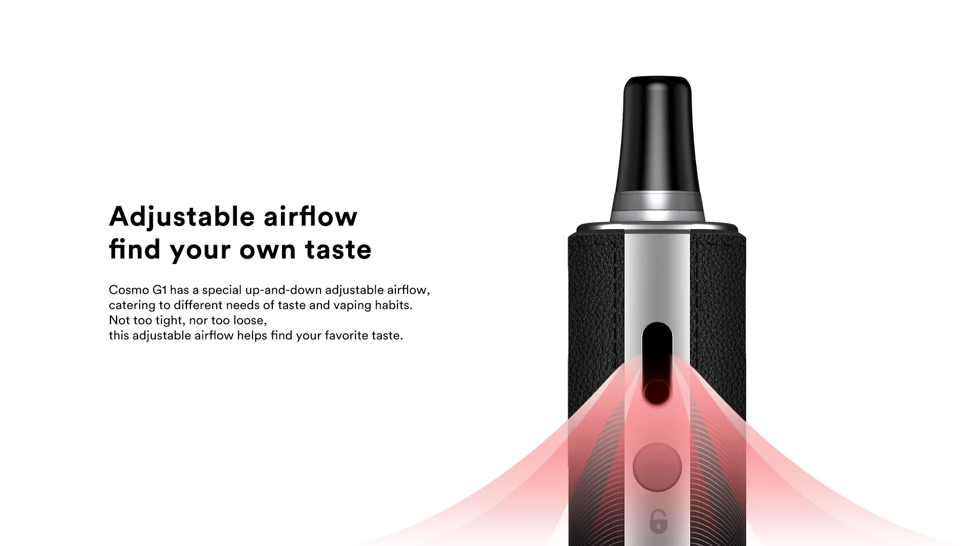 Cosmo G1 a un flux d’air réglable spécial de haut en bas, répondant aux différents besoins de goût et d’habitudes de vaporisation. Ni trop serré, ni trop lâche, ce flux d’air réglable aide à trouver votre goût préféré.