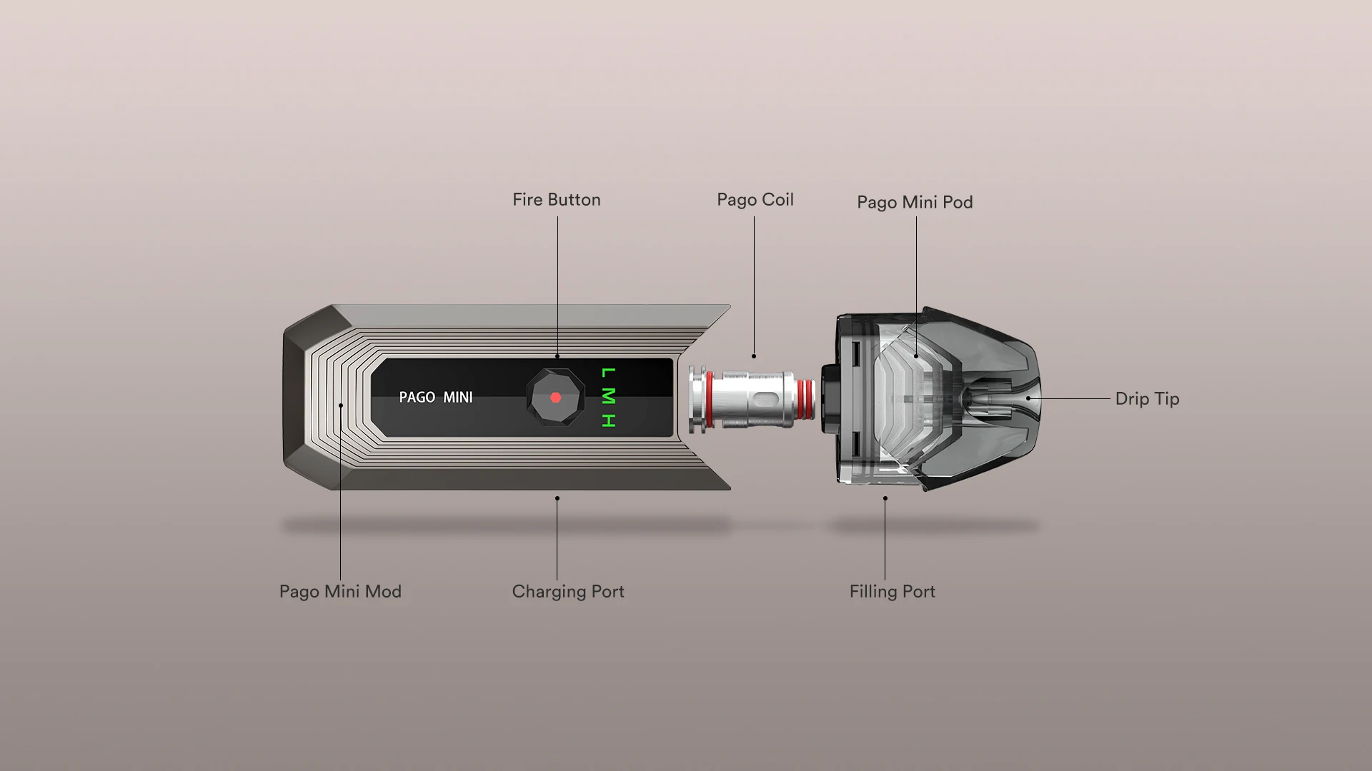 — Pago Mini dispose de 3 niveaux de puissance réglables, qui sont bas, moyen et haut niveau. Il supporte 2 bobines de différentes, 1.0 ohm et 0.6 ohm. La bobine de 1.0 ohm est pour 10-15W, idéal pour la vaporisation MTL, et 0.6 ohm pour 15-25w, idéal pour la vaporisation RDL.