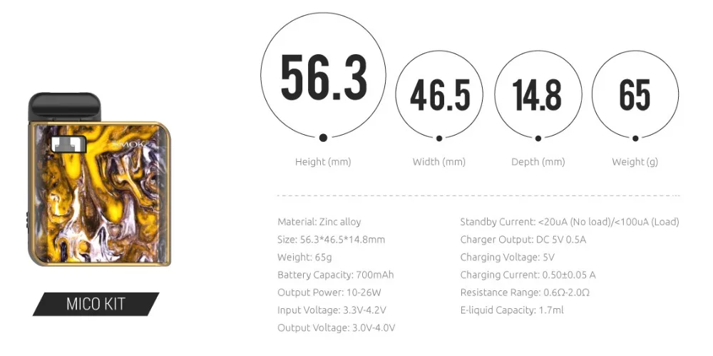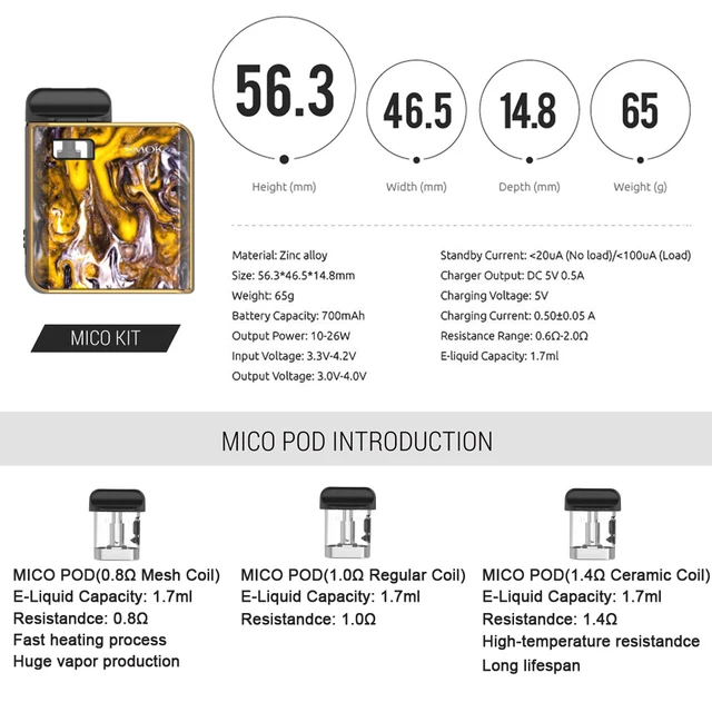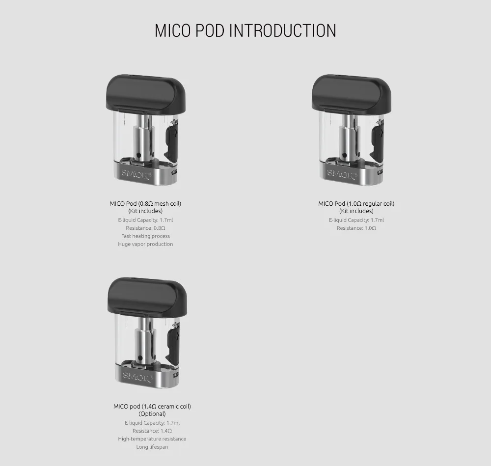 | Compatible Model | Mico Pods Mod Cartridge /0.8ohm Mesh Coil /1.0ohm Regular Ceramic Core |