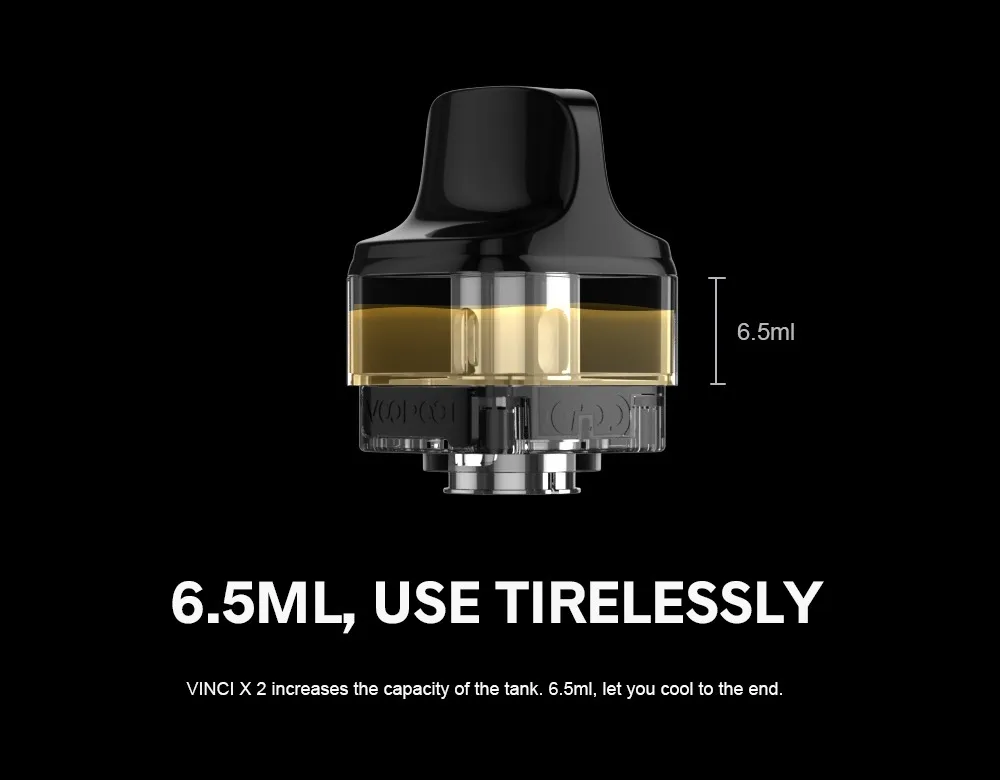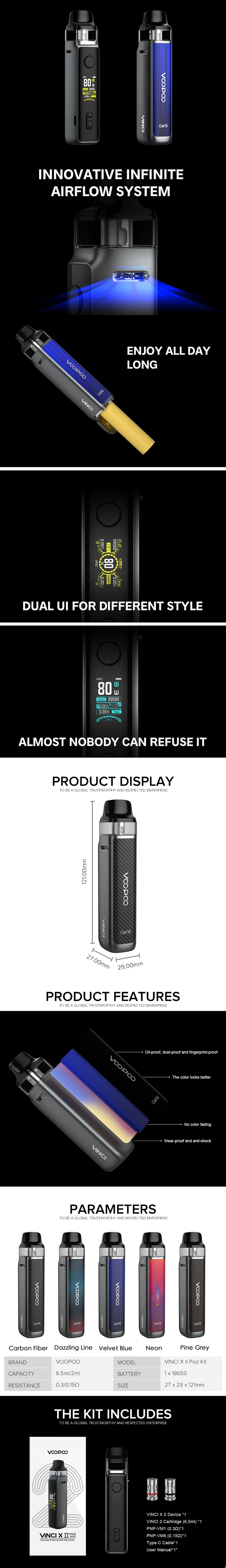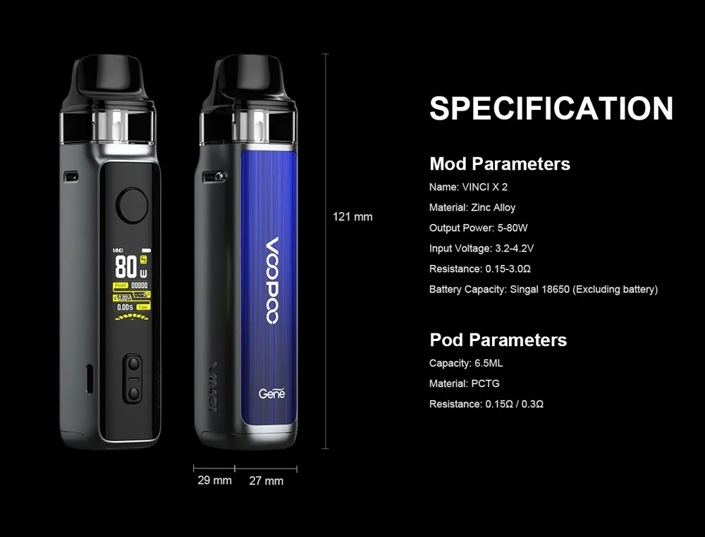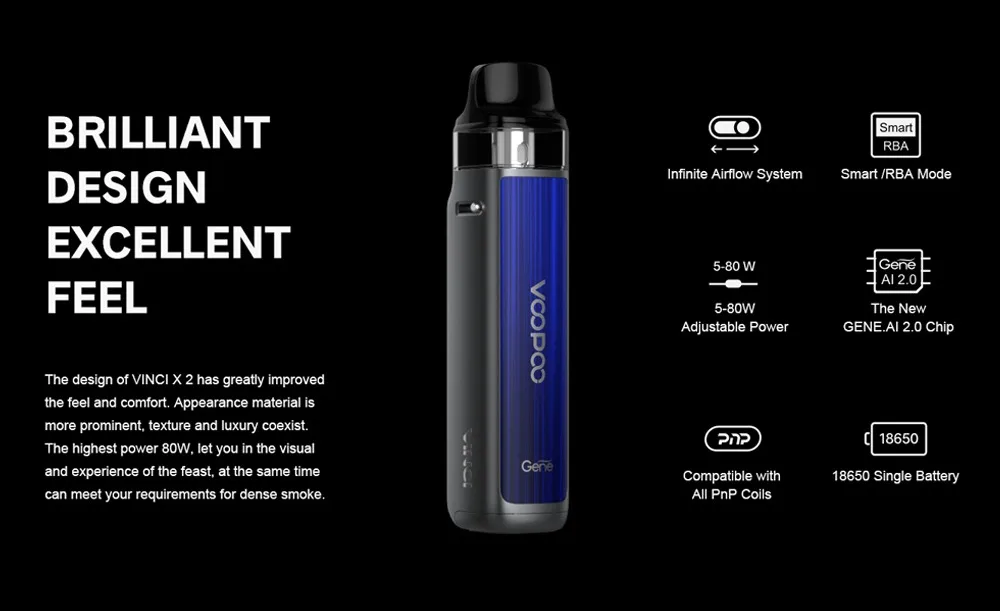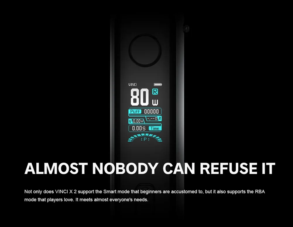 VINCI X 2 Kit a grandement amélioré la sensation et le confort pour répondre à vos exigences de fumée dense. Plus de détails sont conçus pour apporter une toute nouvelle expérience de préhension. Il est beau, durable et est livré avec une grande fonction pour vous offrir une bonne expérience: résistant à l’huile, à la poussière, aux empreintes digitales, à l’usure et aux chocs. Il est alimenté par une seule batterie 18650 et est livré avec une charge de type c, ce qui vous permettra de profiter du temps sans souci. VINCI X 2 Kit est équipé de deux styles différents thèmes D’IU et 1.08 pouces TFT écran couleur pour les différents styles. Alimenté par la nouvelle puce GENE AI 2.0, il a des fonctions puissantes et la puissance de sortie la plus élevée est jusqu’à 80W. VINCI X 2 prend en charge non seulement la mode Intelligent qui débutants sont habitués, mais prend également en charge la RBA mode qui vapoteurs l’amour. Grâce au système innovant de flux d’air infini, vous pouvez obtenir diverses saveurs. VINCI X 2 Cosse peut contenir 6.5ml e-jus et est compatible avec tous les PnP Bobines.
