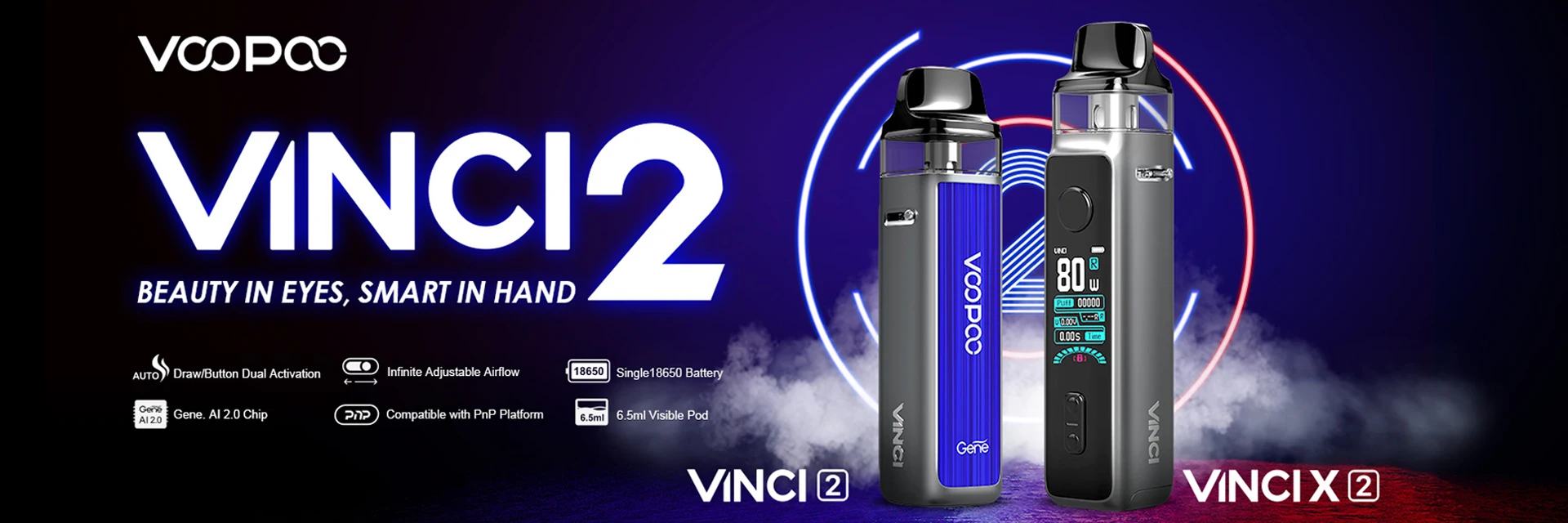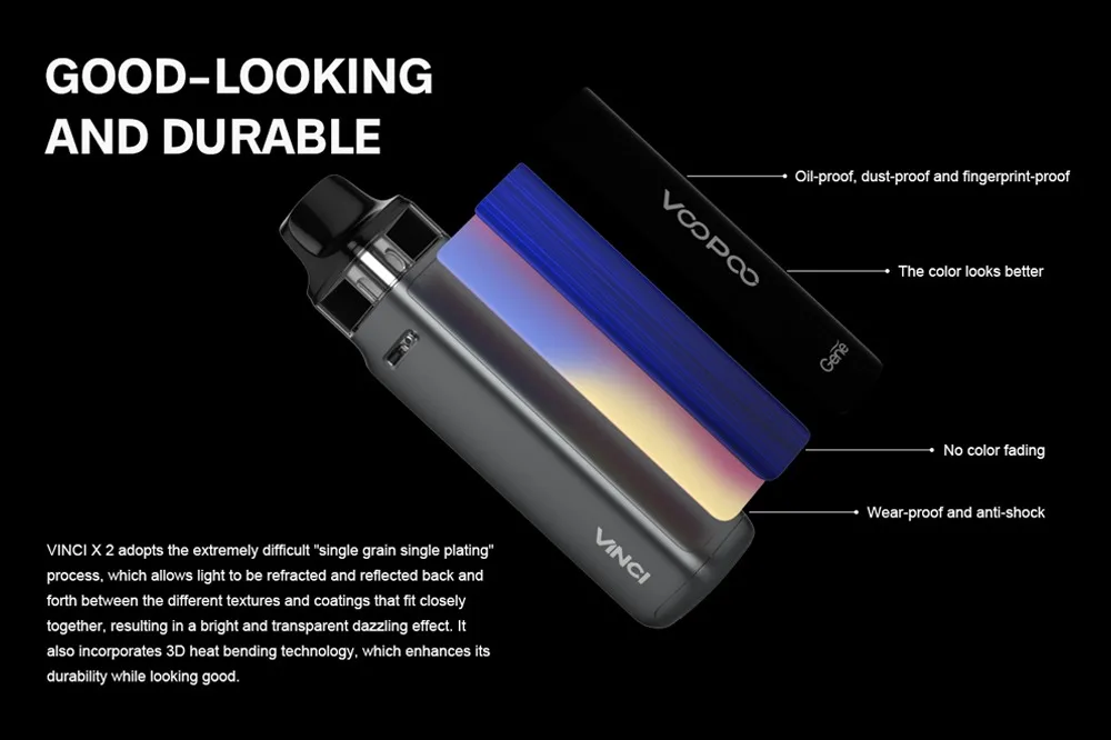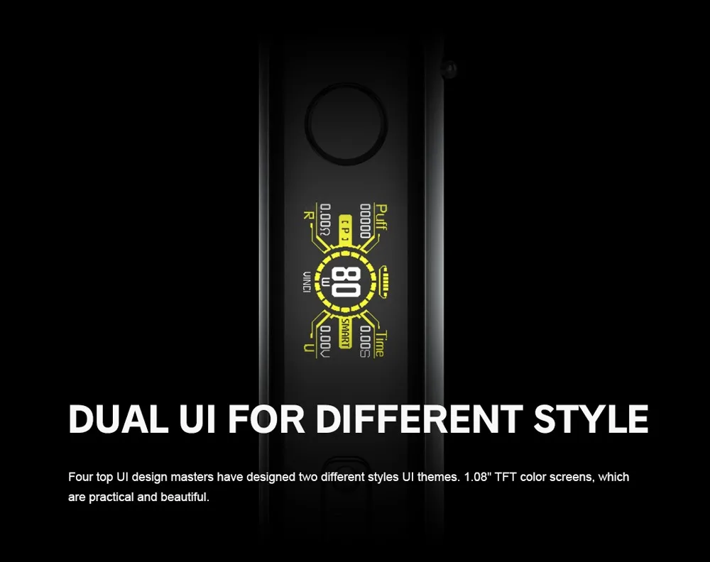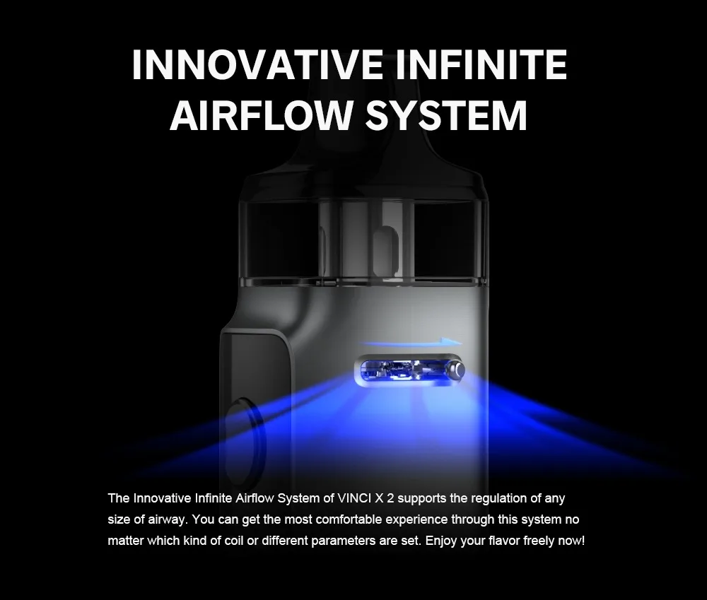 VINCI X 2 Kit a grandement amélioré la sensation et le confort pour répondre à vos exigences de fumée dense. Plus de détails sont conçus pour apporter une toute nouvelle expérience de préhension. Il est beau, durable et est livré avec une grande fonction pour vous offrir une bonne expérience: résistant à l’huile, à la poussière, aux empreintes digitales, à l’usure et aux chocs. Il est alimenté par une seule batterie 18650 et est livré avec une charge de type c, ce qui vous permettra de profiter du temps sans souci. VINCI X 2 Kit est équipé de deux styles différents thèmes D’IU et 1.08 pouces TFT écran couleur pour les différents styles. Alimenté par la nouvelle puce GENE AI 2.0, il a des fonctions puissantes et la puissance de sortie la plus élevée est jusqu’à 80W. VINCI X 2 prend en charge non seulement la mode Intelligent qui débutants sont habitués, mais prend également en charge la RBA mode qui vapoteurs l’amour. Grâce au système innovant de flux d’air infini, vous pouvez obtenir diverses saveurs. VINCI X 2 Cosse peut contenir 6.5ml e-jus et est compatible avec tous les PnP Bobines.