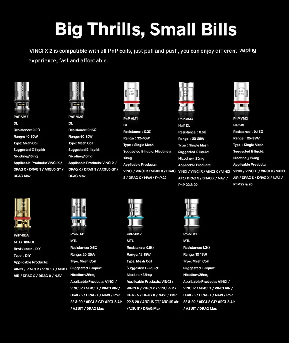 | Compatible Model | All VOOPOO PnP Coils (R1,R2,VM4,VM3,TM1,TM2,TR1…) |