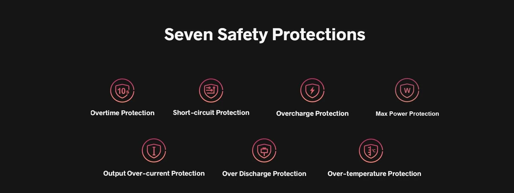 11. Sept protections de sécurité: Protection contre les heures supplémentaires, Protection contre les courts-circuits, Protection contre les surcharges, Protection contre la puissance maximale, Protection contre les surintensités de sortie, Protection contre les surcharges, Protection contre les surchauffes
