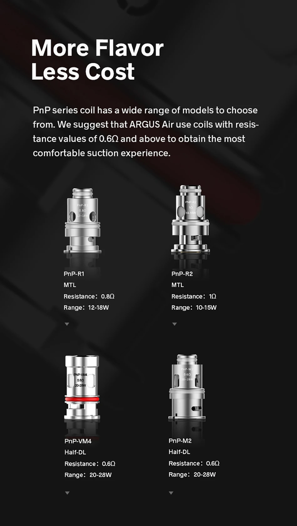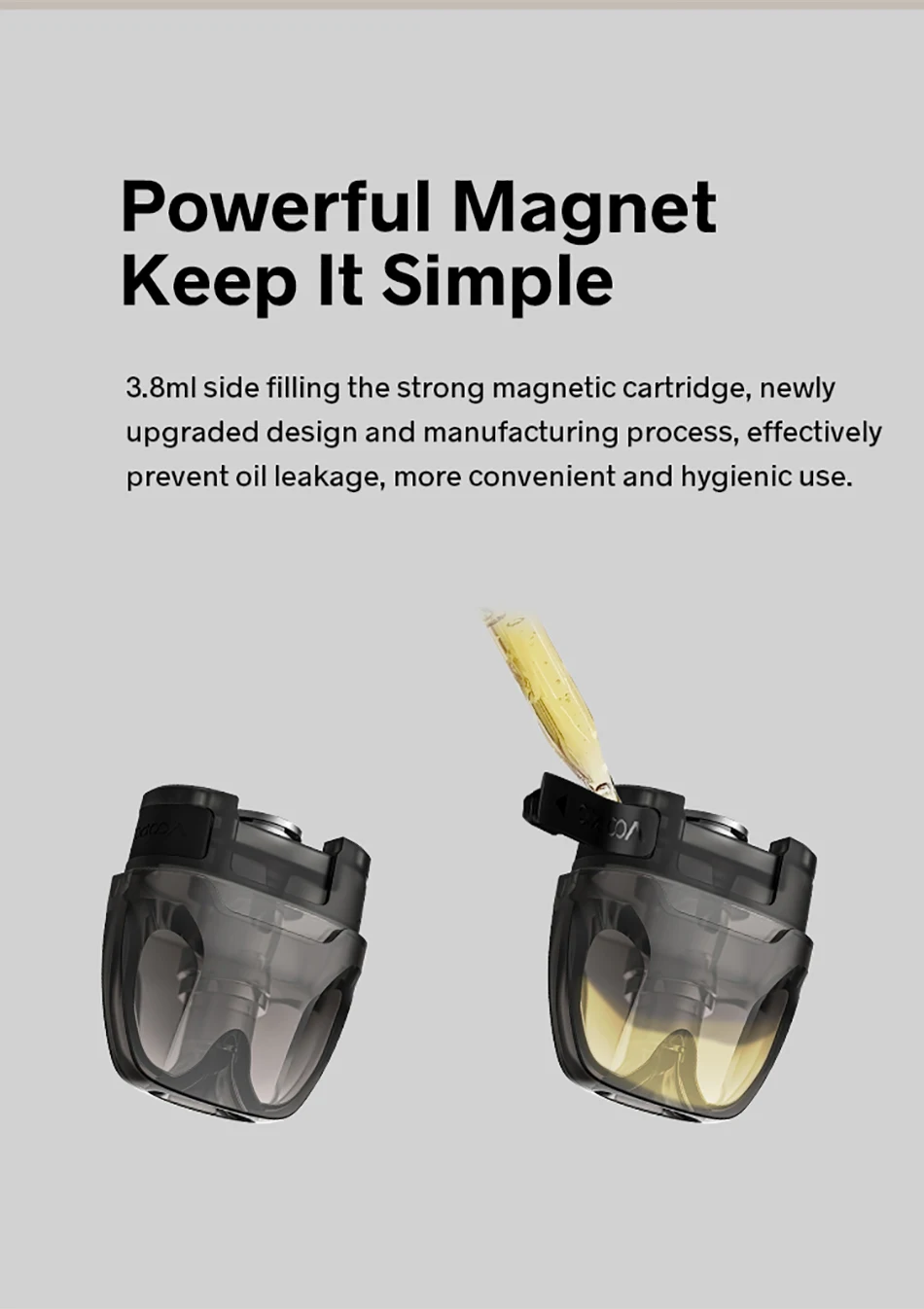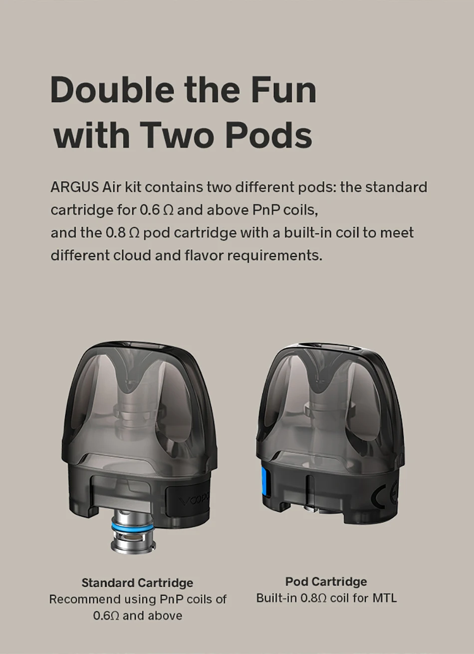 La cartouche VOOPOO Argus Air Pod est spécialement conçue pour le Kit de système VOOPOO Argus Air Pod et fournit deux types de dosettes: la cartouche standard pour 0,6 ohm avec les bobines PnP supérieures, la cartouche de dosette de 0,8 ohm avec une bobine intégrée pour répondre aux différentes exigences de nuage et de saveur. Remplissage latéral de 3.8ml de la cartouche magnétique forte, conception et processus de fabrication nouvellement améliorés empêchent efficacement les fuites de jus électronique. De plus, le flux d’air peut être modifié en tournant la cartouche à 180 °. Pour passer de MTL à RDL, retirez simplement la cartouche d’encre standard, faites-la tourner et réinsérez-la. Une connexion magnétique puissante assure une correspondance parfaite de la cartouche. La cartouche Argus Air pod est compatible avec les bobines de la série PnP. La bobine de la série PnP a une large gamme de modèles à choisir.