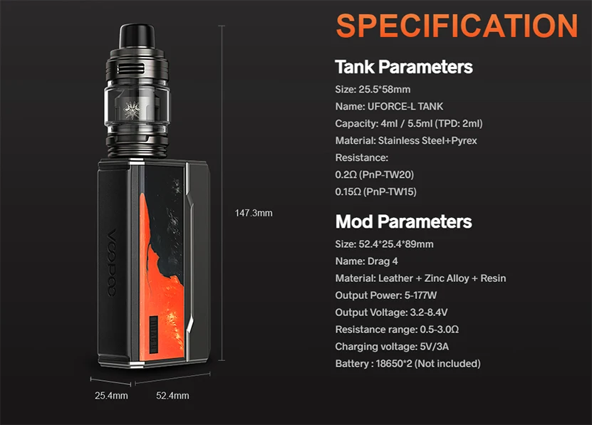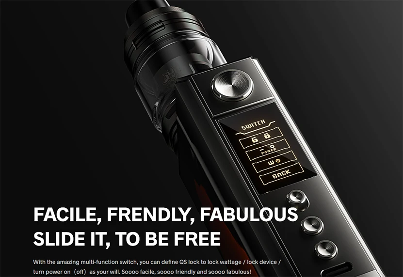 Le Kit de glisser 4 est composé du Mod de glisser 4 et du réservoir de UFORCE-L. Il est alimenté par deux batteries 18650 externes avec 177W max. Avec le Mode ECO et la charge rapide 5V/3A type-c, il offre moins de temps de charge et plus de plaisir de vapotage. En utilisant le nouveau Mode TC, il peut correspondre plus efficacement aux 4 matériaux chauffants tels que Ni200, Ti, SS316, SS430 et répondre aux besoins spécifiques des utilisateurs de bricolage. Le commutateur multifonction permet de définir facilement la fonction de QS lock comme la puissance en watts de verrouillage, le dispositif de verrouillage et la mise hors tension. Le nouveau design de l’interface utilisateur vous permet de définir votre style avec 4 couleurs en option. En outre, il dispose également d’un couvercle de batterie magnétique remplaçable et durable. Le réservoir de UFORCE-L dispose d’une capacité de 4ml/5.5ml e-jus et d’un système de remplissage facile par le haut. Il est conçu avec une entrée d’air supérieure à 3 trous pour fournir un flux d’air équilibré et suffisant et éviter les fuites de condensat et d’e-jus efficacement. Le débit d’air réglable à 360 ° peut également personnaliser votre saveur préférée. En adoptant la base innovante 510 avec la conception de radiateur, il est facile à nettoyer. Le glisser 4 comprend une nouvelle bobine PnP 0.15 Ω/0.2 Ω avec une technologie double en un dans l’emballage pour vous apporter un goût plus riche, un nuage plus dense et une durée de vie plus longue. Il est compatible avec toutes les bobines PnP. Prends ça.