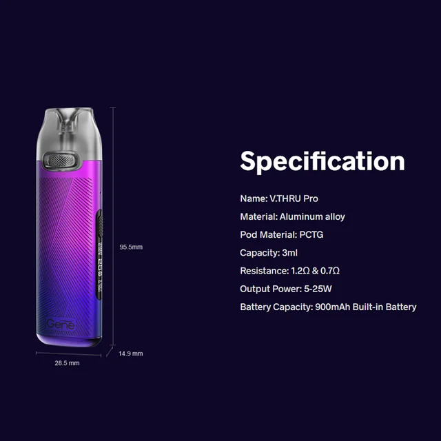 V.THRU Pro Kit est un facile à utiliser et à faible coût de démarrage costume qui est de petite taille mais grande puissance. Il est alimenté par 900mAh construit-dans la batterie capacité avec type-c 5V/1A rapide de charge. Avec conception sans bouton, V.THRU Pro est facile pour vous à commencer, ramasser et inhaler. Il est livré avec 3ml 0.7ohm et 1.2ohm double V.THRU Pro Gousses, qui vous fournira toute la résolution et saveur. Et le GÈNE Puce apportera une tension de sortie constante à vous donner un parfait saveur expérience. 0.69 pouces OLED écran vous montre les informations de dispositif. Il est également conçu avec enfant intelligent-preuve mode à empêcher les enfants de démarrage accidentel. Avec la 360 ° entièrement-conception en forme, vous vous sentirez votre saveur, pas un pod. Le magnétique d’aspiration et boucle conception et super-easy groove fermoir conception, faire il insérer serré et retirer facilement.