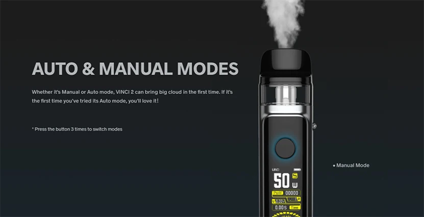 VINCI 2 Kit est le dernier Kit Pod Mod de la série VINCI. Le Mod adopte le processus «grain unique, revêtement unique» pour fournir résistant à l’usure, aux chocs, à l’huile, à la poussière et aux empreintes digitales. Il intègre également la technologie de pliage thermique 3D, qui peut améliorer sa durabilité. La batterie intégrée de 1500mAh peut se recharger rapidement via le port de type-c. Le Kit VINCI 2 adopte une puce Gene.AI 2.0 améliorée, la puissance peut atteindre 50W. Il fournit un double écran d’interface utilisateur, un enregistrement de bouffée, le Mode VW/SMART/RBA pour satisfaire vos besoins de vapotage. VINCI 2 Pod a une capacité de 6.5ml. Le système innovant de flux d’air infini prend en charge la régulation de toute taille de voie aérienne. Compatible avec toutes les bobines de la série PnP, VINCI 2 apportera des nuages massifs et une expérience MTL/RDL.