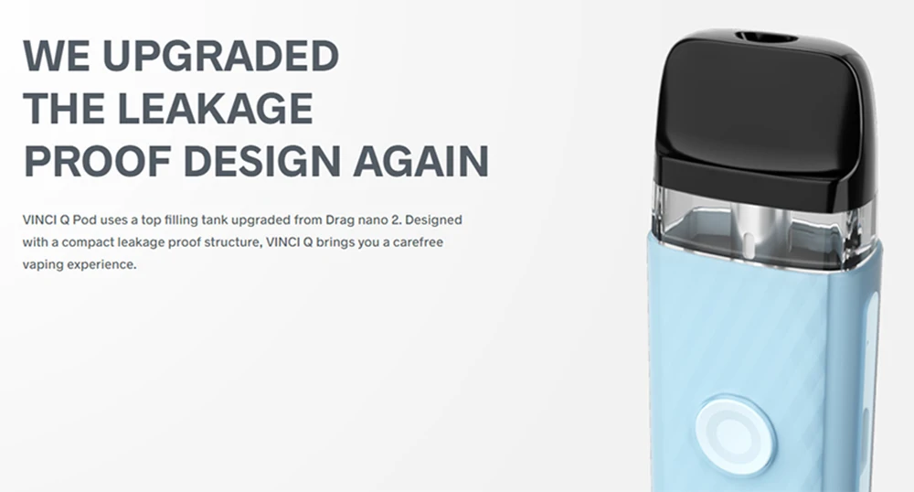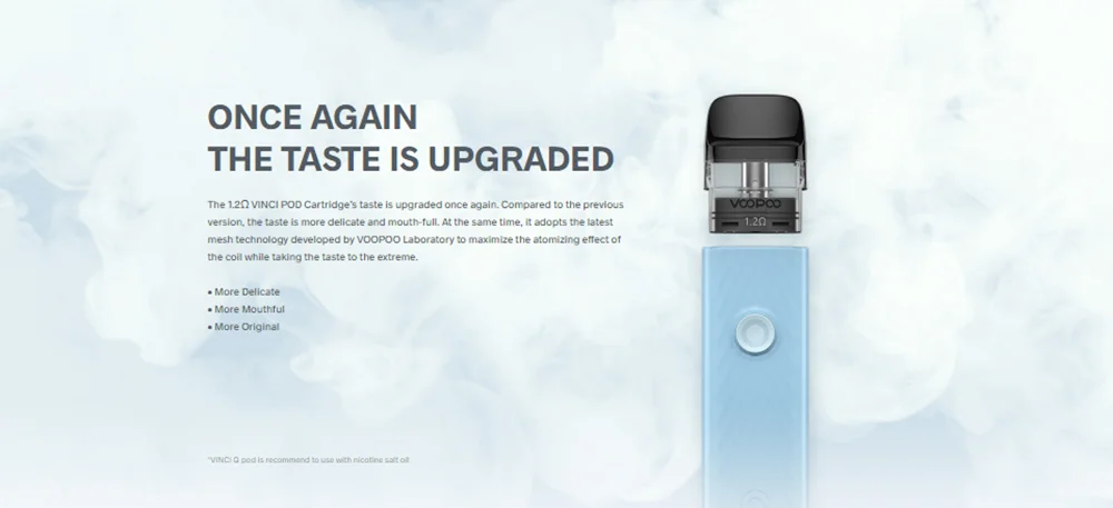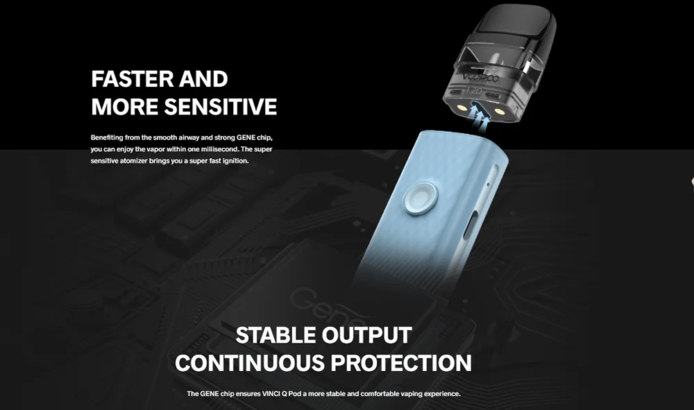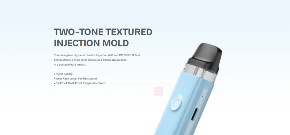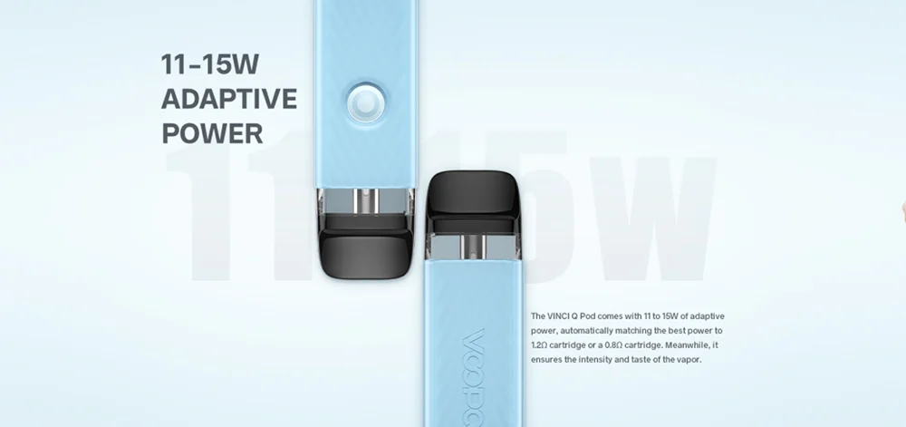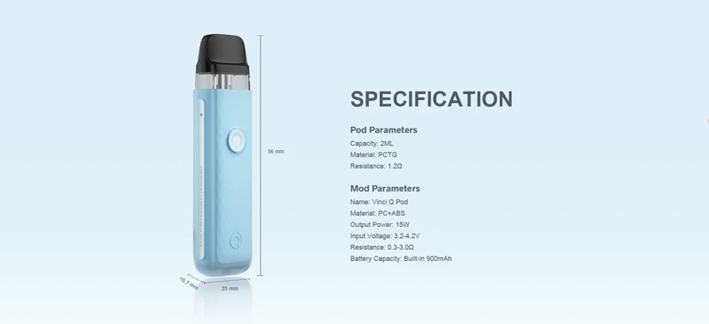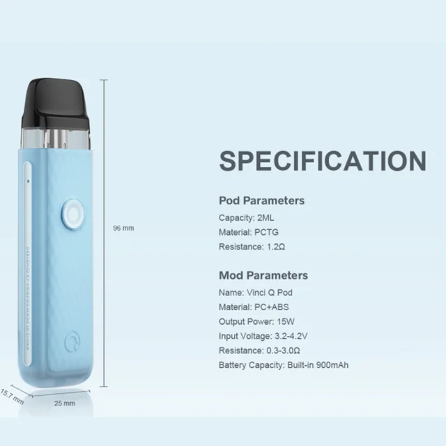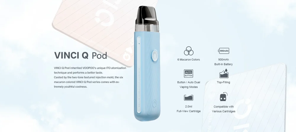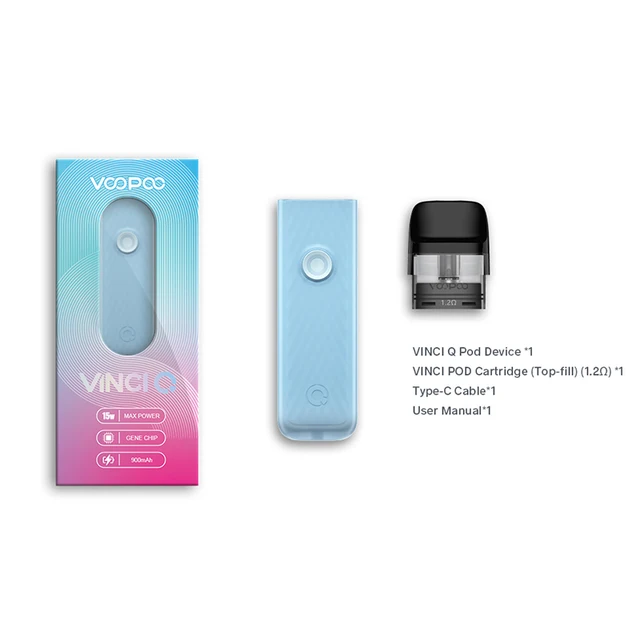 VINCI Q Pod Kit hérité de VOOPOO unique ITO atomisation tech pour apporter la plus pure saveur. Il est coulé par le deux-tone texturé injection moule et a 6 macaron couleurs. Fait de léger PC et ABS matériaux, il est durable en cours d’utilisation et à la mode en apparence. VINCI Q Pod Kit est alimenté par un construit-dans 900mAh batterie avec Type-C de charge. Il est livré avec 11-15W puissance adaptative, qui peut correspondre intelligemment le meilleur rapport puissance-0.8ohm ou 1.2ohm cartouche. Bénéficier de la GÈNE puce et lisse des voies aériennes, il a bouton/auto double vaping modes et plus rapide d’allumage à vous apporter une meilleure expérience vaping. Il également a 2ml e-jus de capacité et facile top système de remplissage. En outre, VINCI Q Pod Kit est compatible avec VOOPOO VINCI Pod Cartouche, VINCI Pod Cartouche Royal Édition et Glisser Nano 2 Pod Cartouche.