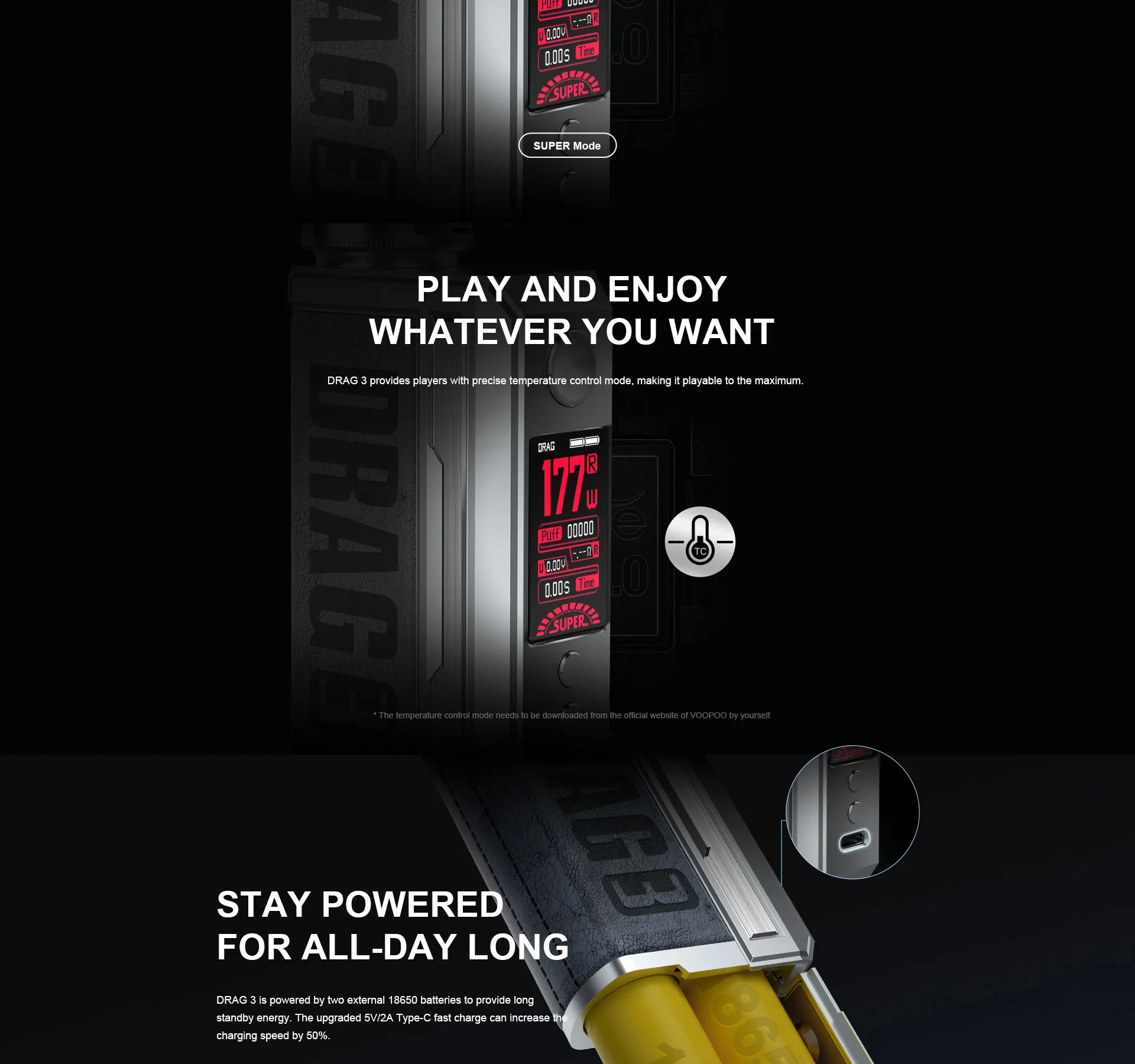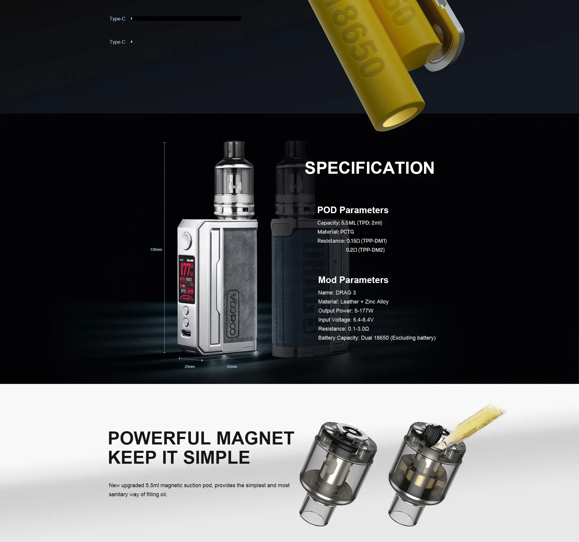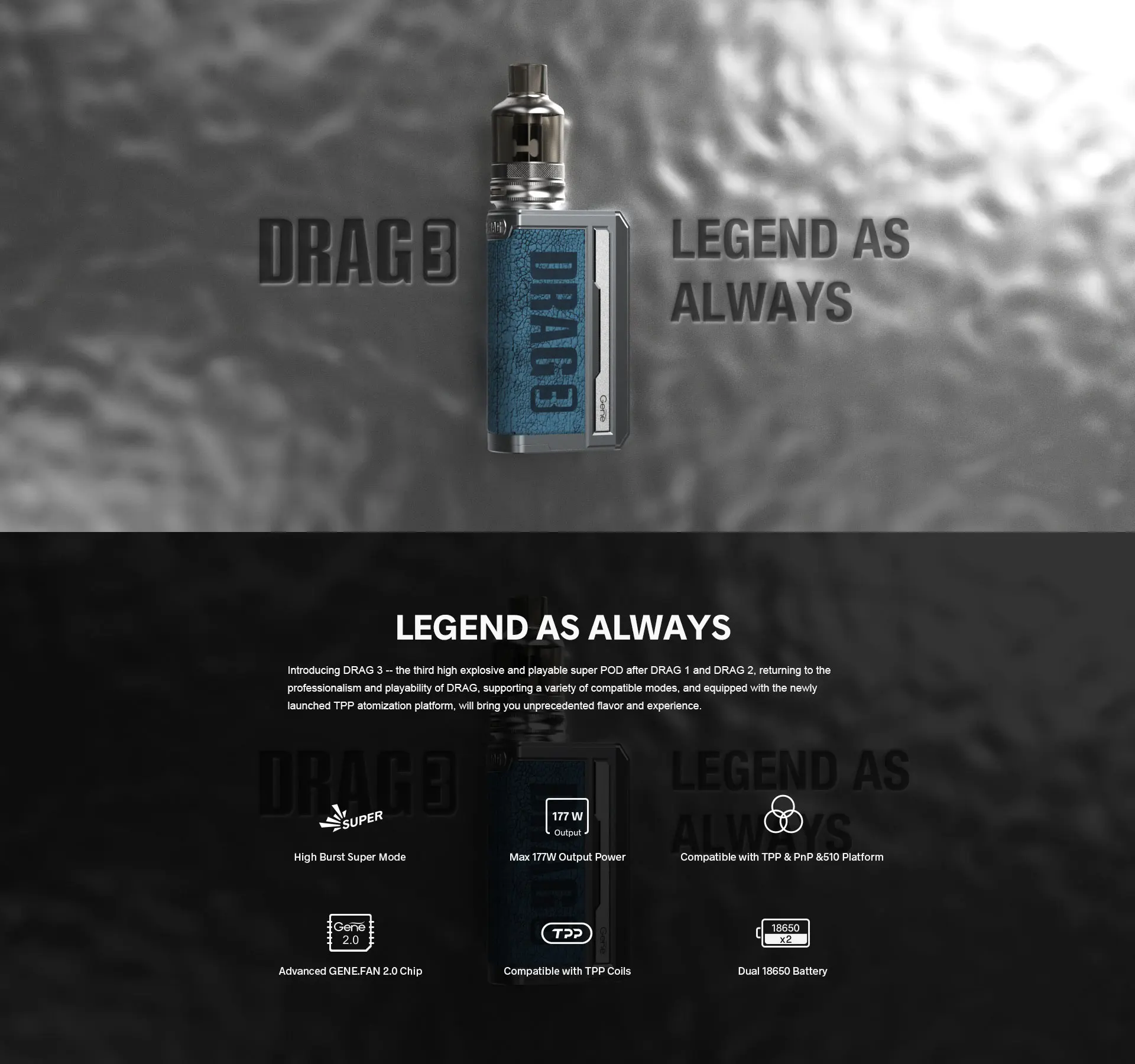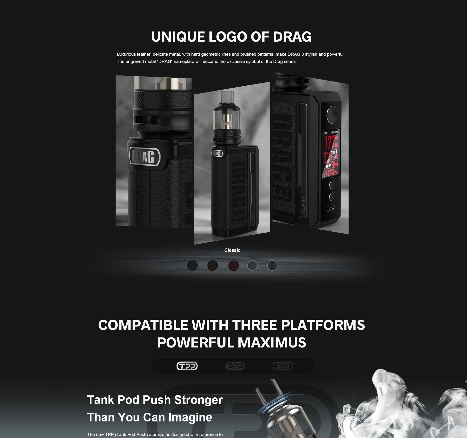 Drag 3 Kit est le troisième super Kit explosif et jouable après Drag 1 et Drag 2. VOOPOO Drag 3 Mod Kit prend en charge une variété de modes compatibles, et équipé de la plate-forme d’atomisation TPP nouvellement lancée. VOOPOO Drag 3 Kit se compose de Drag 3 Mod et réservoir TPP (Tank Pod Push). VOOPOO Drag 3 Mod adopte le jeu de puces avancé GENE.FAN 2.0, il fournit une forte puissance explosive, une sortie stable et des fonctions intelligentes riches. La puce GENE.FAN 2.0 améliorée peut générer 177W de puissance par deux batteries 18650, qui peuvent utiliser pleinement les bobines TPP pour fournir une saveur et une expérience sans précédent. Il est également compatible avec tous les atomiseurs 510 via le connecteur supérieur 510. Drag 3 Mod prend en charge les modes Super/Smart/RBA/TC pour satisfaire les débutants et les joueurs professionnels. Le nouvel atomiseur TPP est conçu avec la structure des voies respiratoires «Simulation aérodynamique» et «Convection bidirectionnelle» pour maximiser pleinement l’efficacité de l’atomisation. C’est un système d’atomiseur universel à faible coût. Le réservoir TPP peut contenir 5.5ml, adopte un remplissage par le bas. La ventouse magnétique offre un moyen simple et hygiénique de remplir l’huile. Il est compatible avec toutes les bobines TPP.