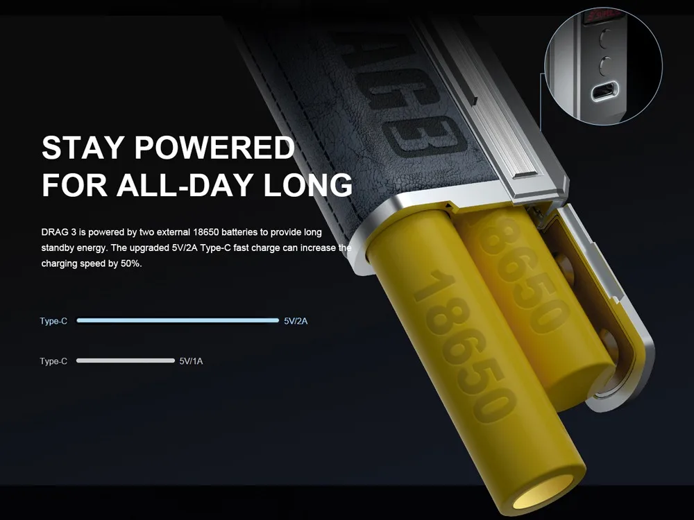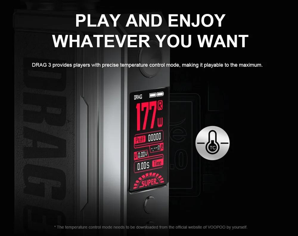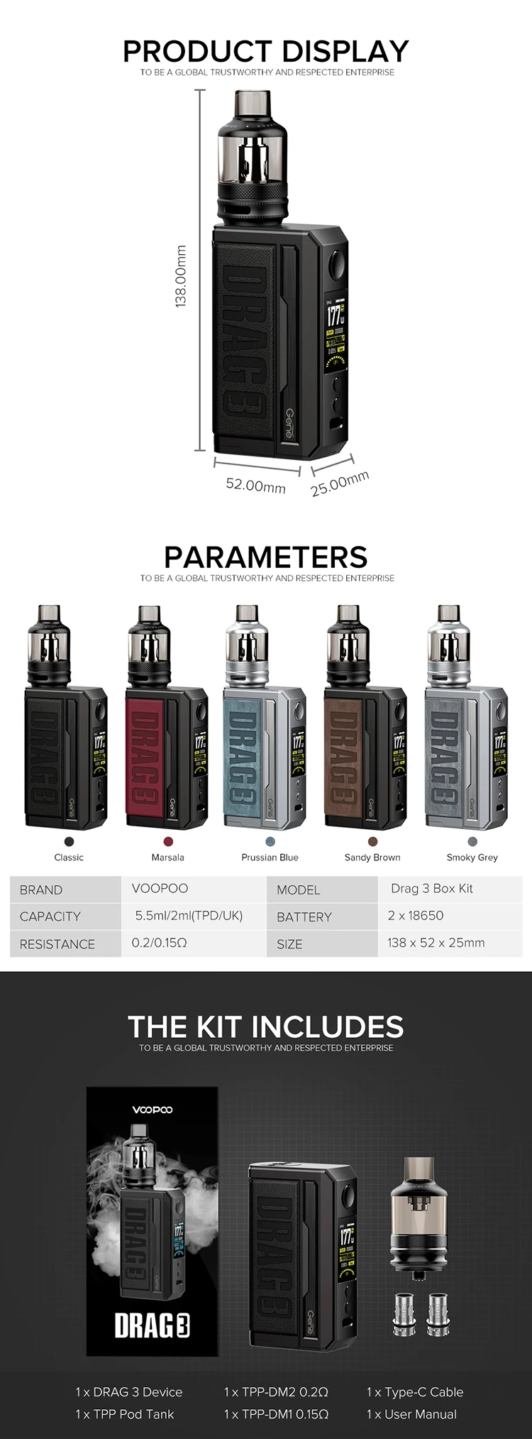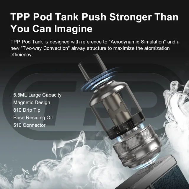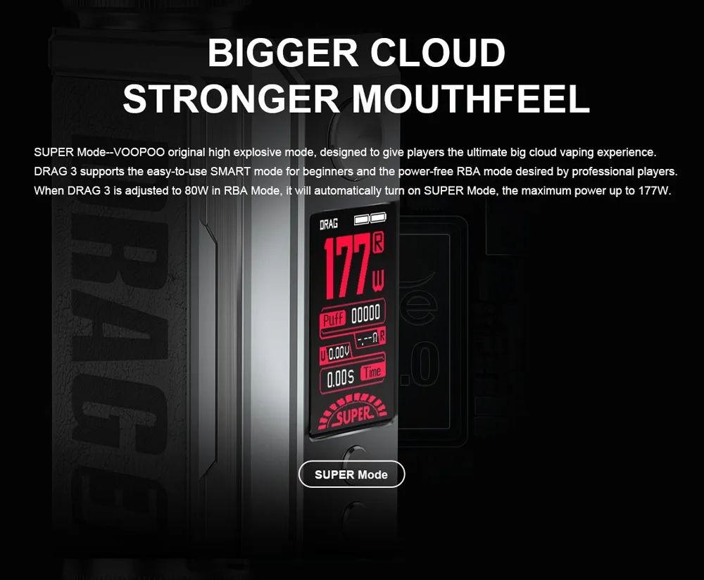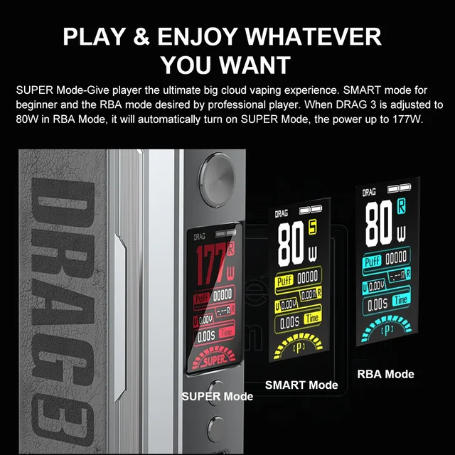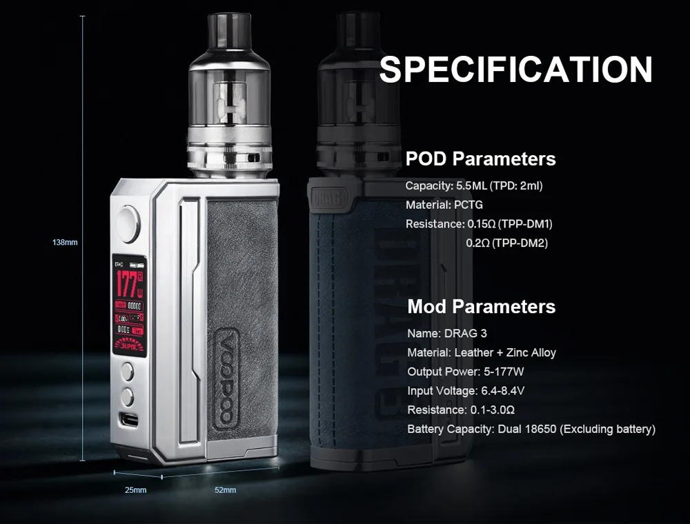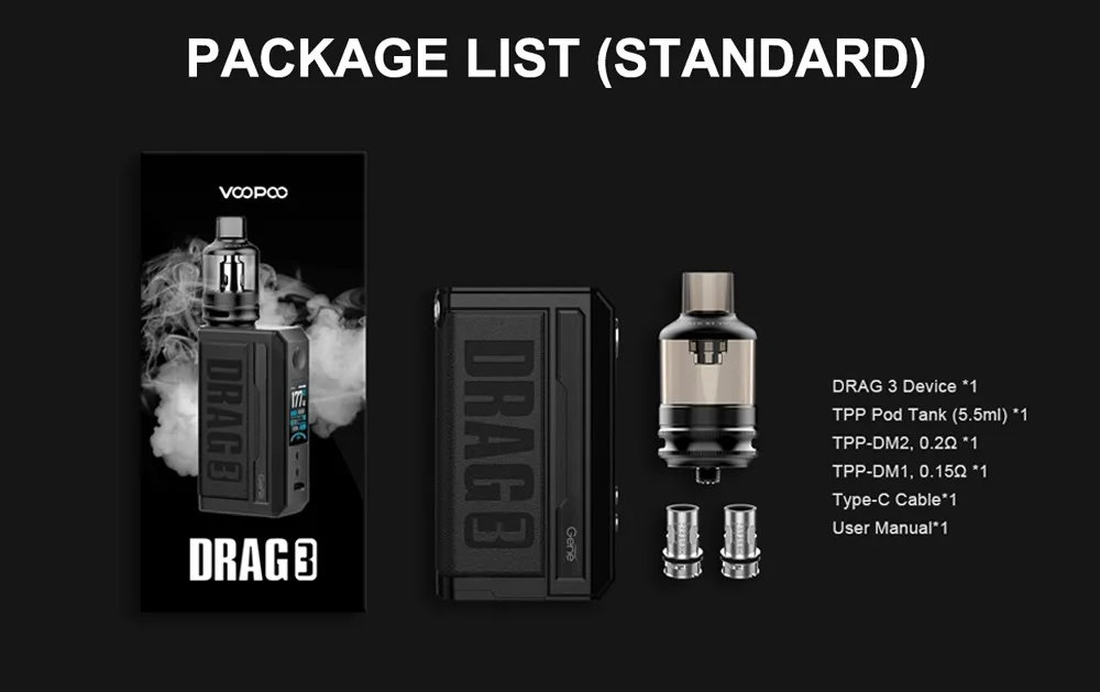 Drag 3 Kit est le troisième super Kit explosif et jouable après Drag 1 et Drag 2. VOOPOO Drag 3 Mod Kit prend en charge une variété de modes compatibles, et équipé de la plate-forme d’atomisation TPP nouvellement lancée. VOOPOO Drag 3 Kit se compose de Drag 3 Mod et réservoir TPP (Tank Pod Push). VOOPOO Drag 3 Mod adopte le jeu de puces avancé GENE.FAN 2.0, il fournit une forte puissance explosive, une sortie stable et des fonctions intelligentes riches. La puce GENE.FAN 2.0 améliorée peut générer 177W de puissance par deux batteries 18650, qui peuvent utiliser pleinement les bobines TPP pour fournir une saveur et une expérience sans précédent. Il est également compatible avec tous les atomiseurs 510 via le connecteur supérieur 510. Drag 3 Mod prend en charge les modes Super/Smart/RBA/TC pour satisfaire les débutants et les joueurs professionnels. Le nouvel atomiseur TPP est conçu avec la structure des voies respiratoires «Simulation aérodynamique» et «Convection bidirectionnelle» pour maximiser pleinement l’efficacité de l’atomisation. C’est un système d’atomiseur universel à faible coût. Le réservoir TPP peut contenir 5.5ml, adopte un remplissage par le bas. La ventouse magnétique offre un moyen simple et hygiénique de remplir l’huile. Il est compatible avec toutes les bobines TPP.