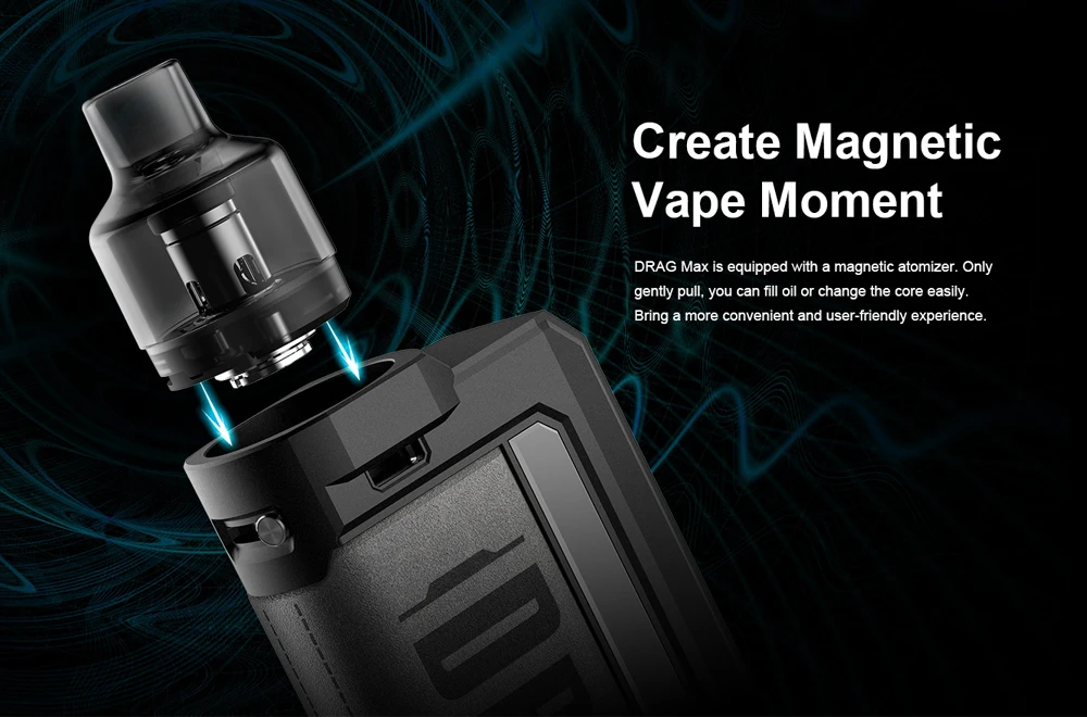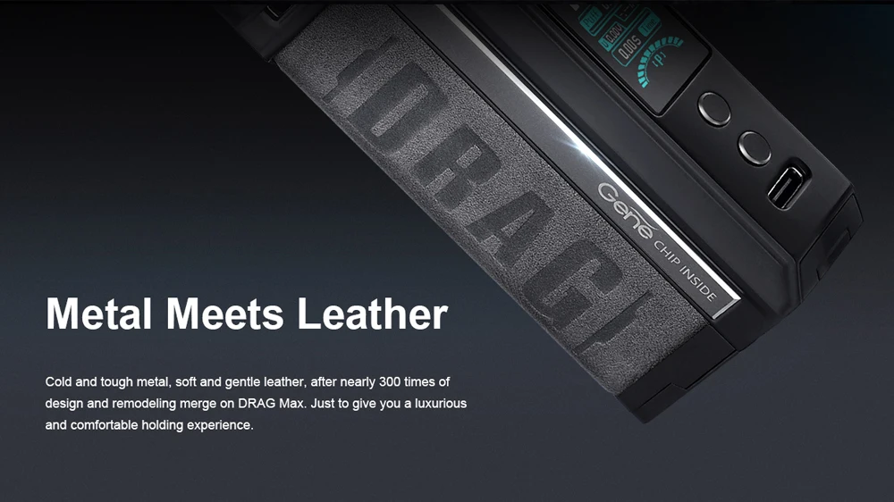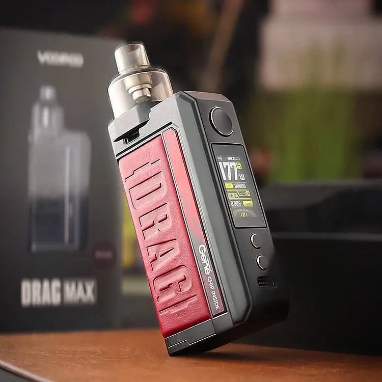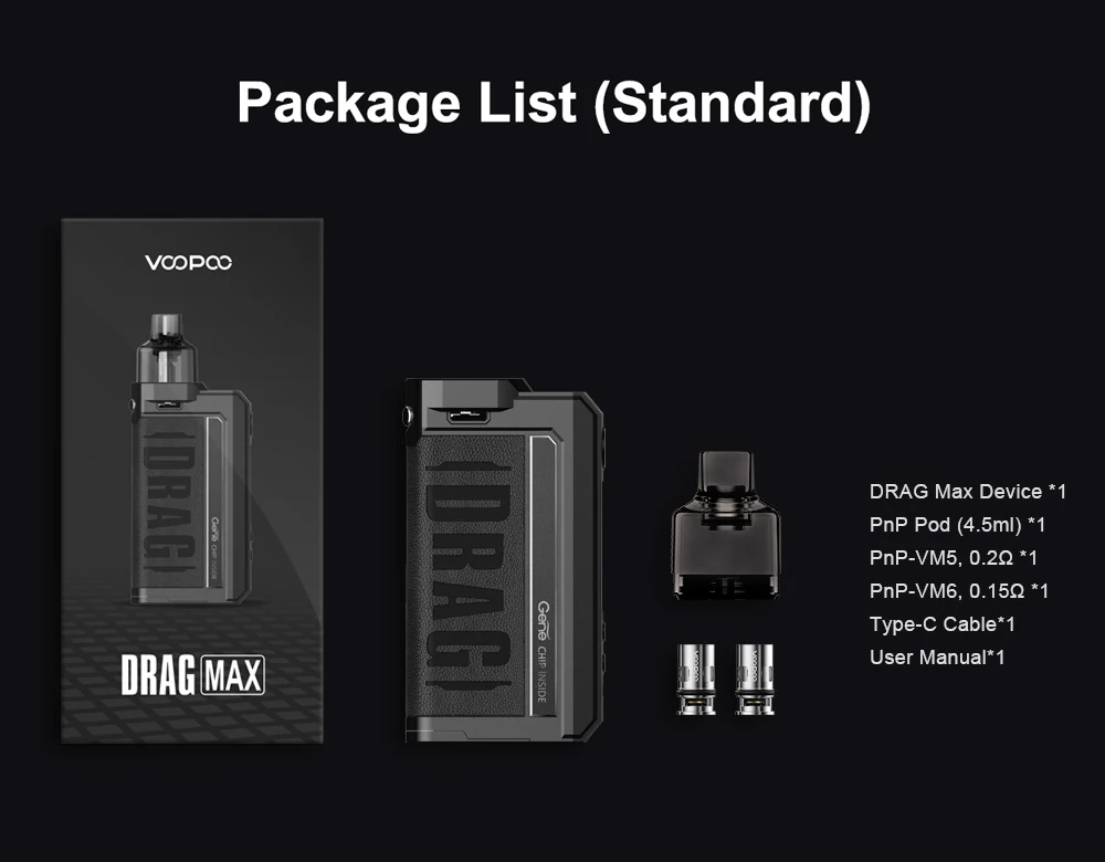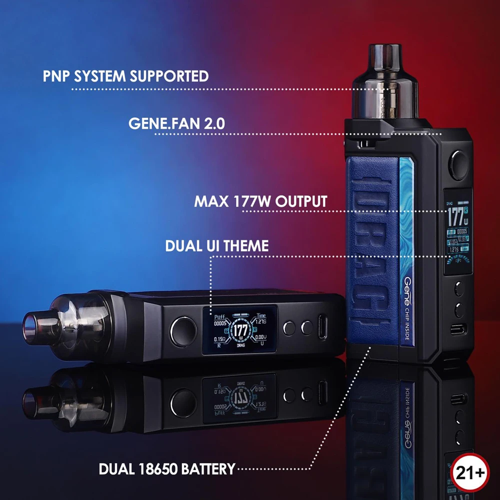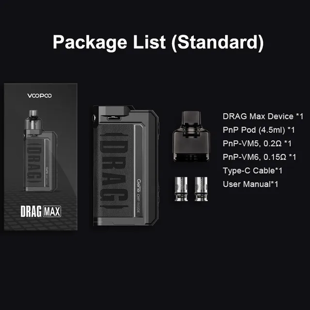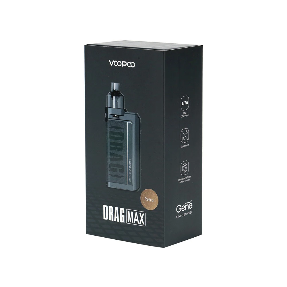 Drag Max Kit est un dispositif époxy à double batterie avec atomiseur magnétique. Il est alimenté par deux batteries 18650 avec une plage de puissance de 5-177W. Fabriqué en métal et en cuir, il est résistant et doux. La marque nouvellement mise à niveau GEME.FAN 2.0 chip donne Drag Max certaines fonctions innovantes, telles que l’allumage extrême 0.001s, la sortie stable dynamique, interactif intelligent. Il est livré avec deux thèmes d’interface utilisateur de styles différents, vous pouvez profiter des deux thèmes avec un écran couleur TFT de 1.08 pouces. De plus, Drag Max offre deux modes pour répondre aux différents besoins de vaporisation: mode intelligent facile à utiliser pour les débutants, mode RBA sans alimentation pour les vapeurs professionnelles. Il a une compatibilité universelle de l’atomiseur: PnP Pod, PnP MTL Pod, PnP RTA Pod et vous pouvez utiliser celui que vous aimez avec Drag Max. Il est également compatible avec toutes les bobines PnP. La capacité est de 4.5ml.