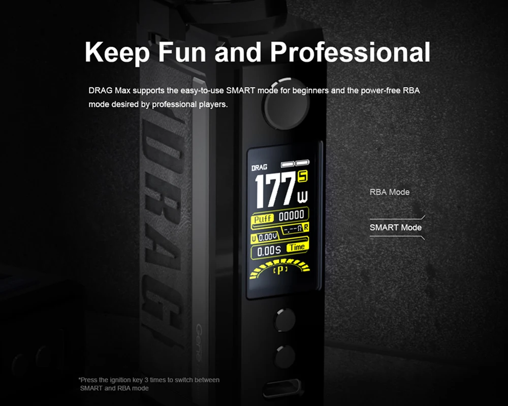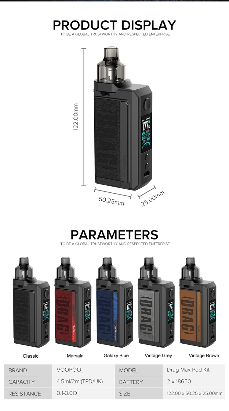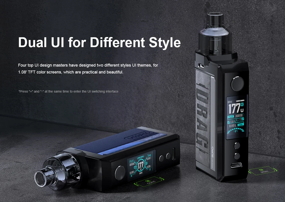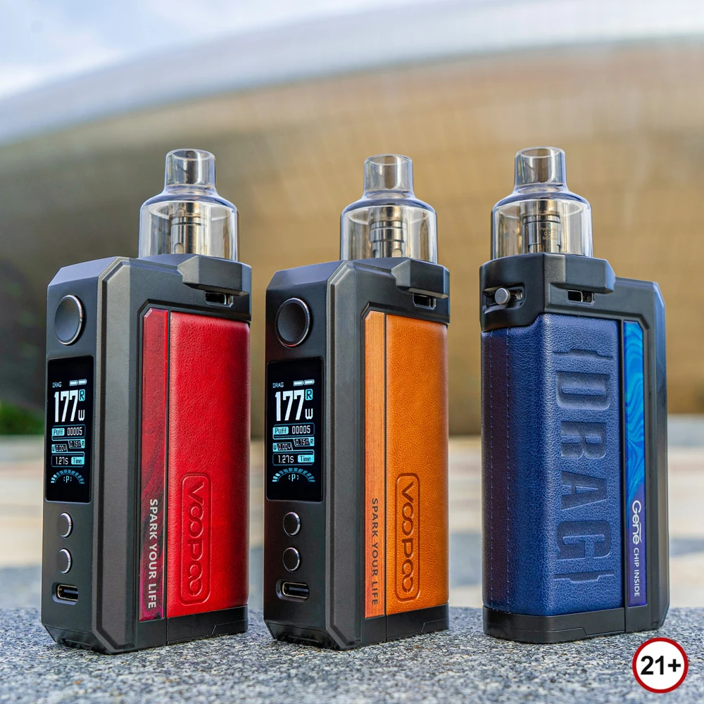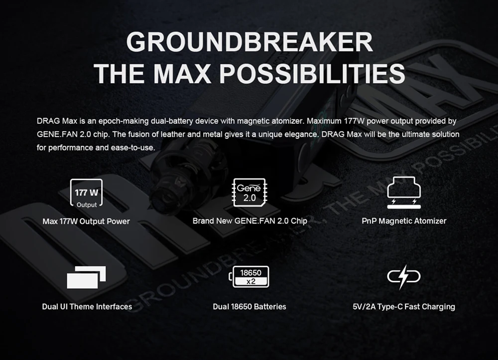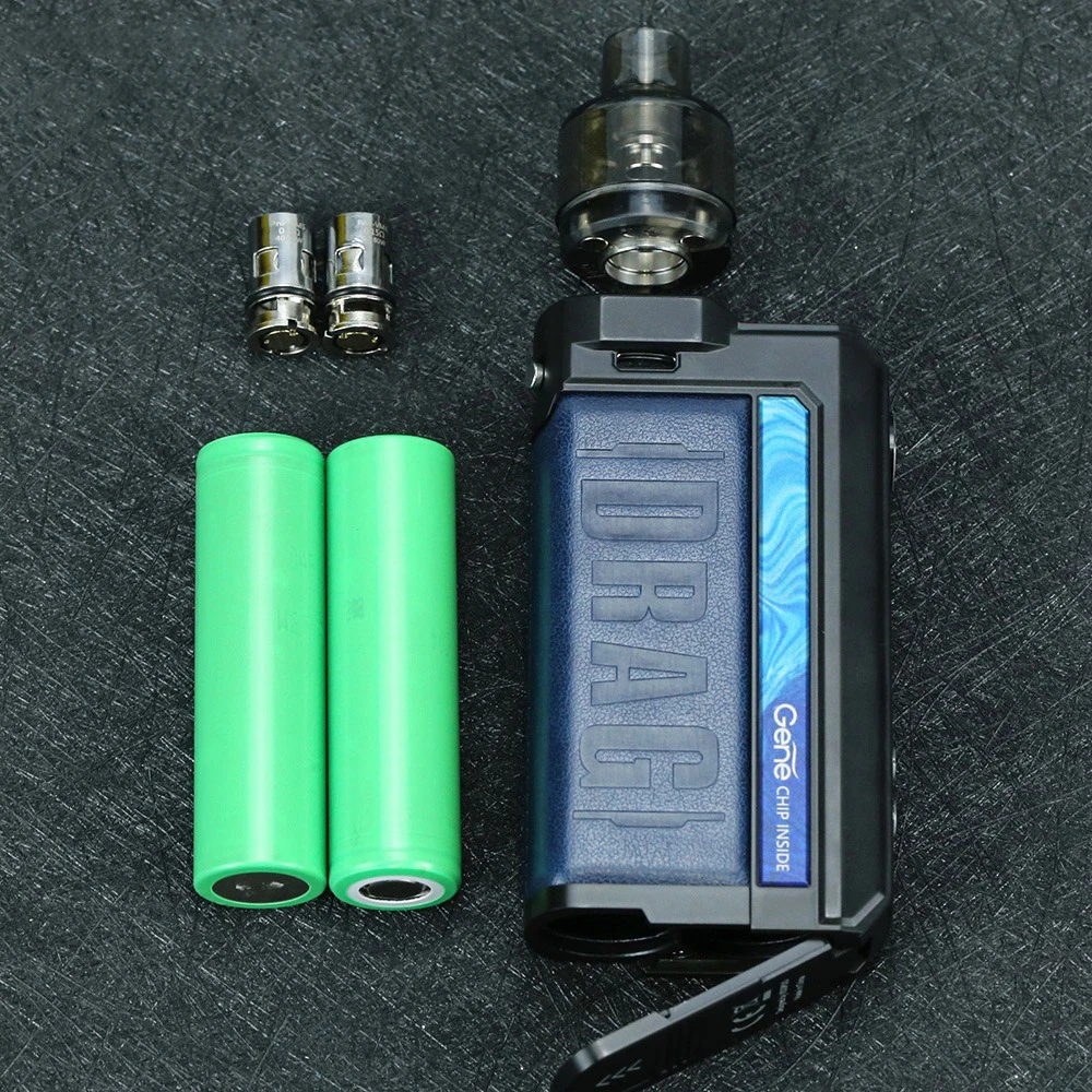Drag Max Kit est un dispositif époxy à double batterie avec atomiseur magnétique. Il est alimenté par deux batteries 18650 avec une plage de puissance de 5-177W. Fabriqué en métal et en cuir, il est résistant et doux. La marque nouvellement mise à niveau GEME.FAN 2.0 chip donne Drag Max certaines fonctions innovantes, telles que l’allumage extrême 0.001s, la sortie stable dynamique, interactif intelligent. Il est livré avec deux thèmes d’interface utilisateur de styles différents, vous pouvez profiter des deux thèmes avec un écran couleur TFT de 1.08 pouces. De plus, Drag Max offre deux modes pour répondre aux différents besoins de vaporisation: mode intelligent facile à utiliser pour les débutants, mode RBA sans alimentation pour les vapeurs professionnelles. Il a une compatibilité universelle de l’atomiseur: PnP Pod, PnP MTL Pod, PnP RTA Pod et vous pouvez utiliser celui que vous aimez avec Drag Max. Il est également compatible avec toutes les bobines PnP. La capacité est de 4.5ml.
