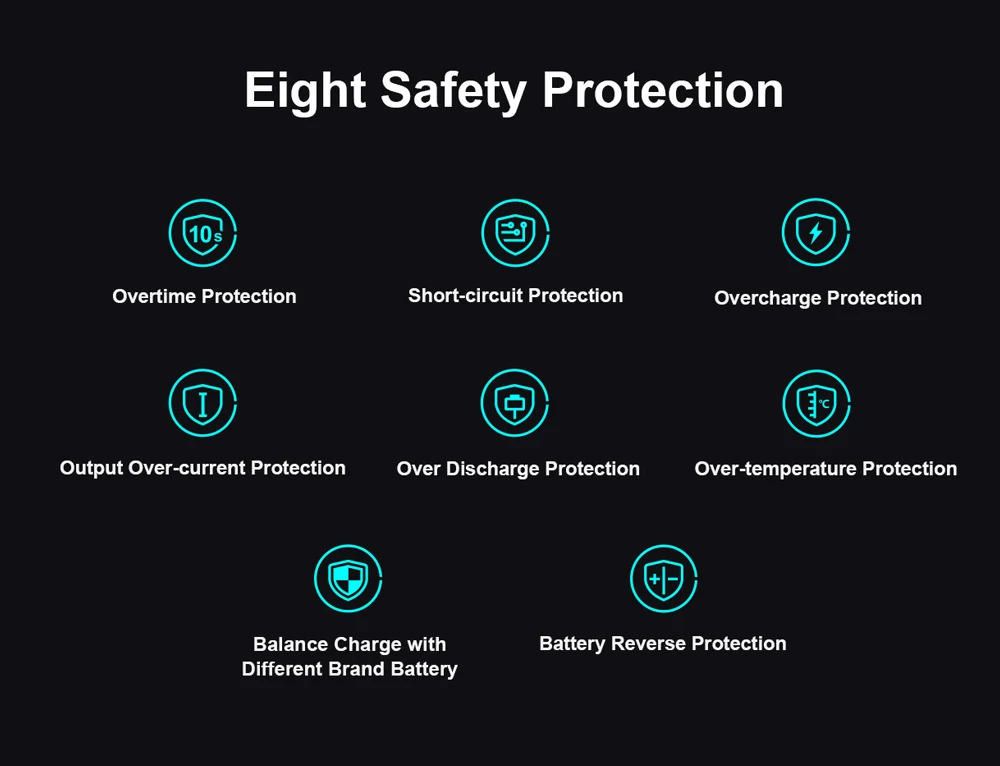 12. Protections de sécurité: heures supplémentaires/court-circuit/surcharge/surintensité de sortie/décharge excessive/surchauffe/Charge d’équilibre avec batterie de marque différente/Protection inverse de batterie