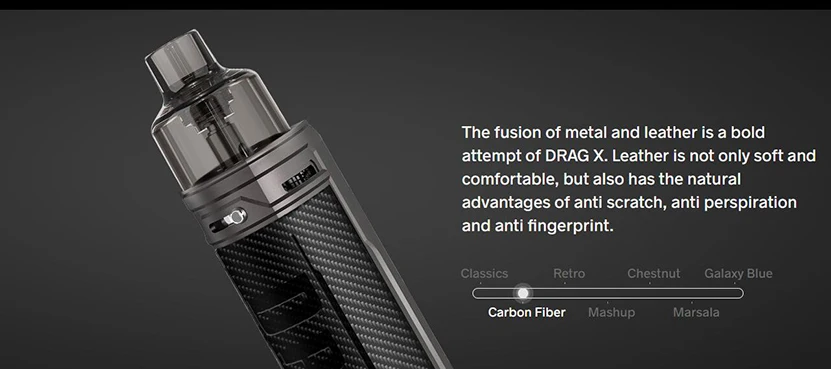 Le Kit Drag X est fait de métal et de cuir, donc Drag X est non seulement doux, mais présente également des avantages d’anti-rayure, d’anti-transpiration et d’anti-empreinte digitale. Il est alimenté par une seule batterie 18650. Avec la nouvelle puce GENE.TT, Drag X dispose d’un allumage rapide (ne prend que 0.001s) et d’une rafale élevée. La puce GENE.TT offre également des fonctions intelligentes telles que les pompes et le mode de classement des points. De plus, le mode de classement des points vous aide à débloquer en continu le nouveau niveau de «fer» à «roi» en fonction de la taille du nuage de chaque aspiration. Il est livré avec une plage de puissance de 5-80W pour répondre à vos besoins et la puissance maximale de 80W vous permettra de créer des nuages plus savoureux. Drag X est conçu avec le système innovant de flux d’air infini qui prend en charge la régulation de toute taille de voie aérienne. Plus important encore, vous pouvez profiter de l’expérience la plus confortable grâce à ce système, quel que soit le type de bobine ou les différents paramètres définis! Quant au pod, il peut contenir une grande capacité de 4.5ml de jus électronique et adopter une large gamme de bobines, y compris RBA. Des adaptateurs 510 et d’autres nouvelles technologies sont également ajoutés à ce pod. Drag X est équipé d’une bobine PnP de 0,15 ohm et de 0,3 ohm et il est compatible avec toutes les bobines PnP.