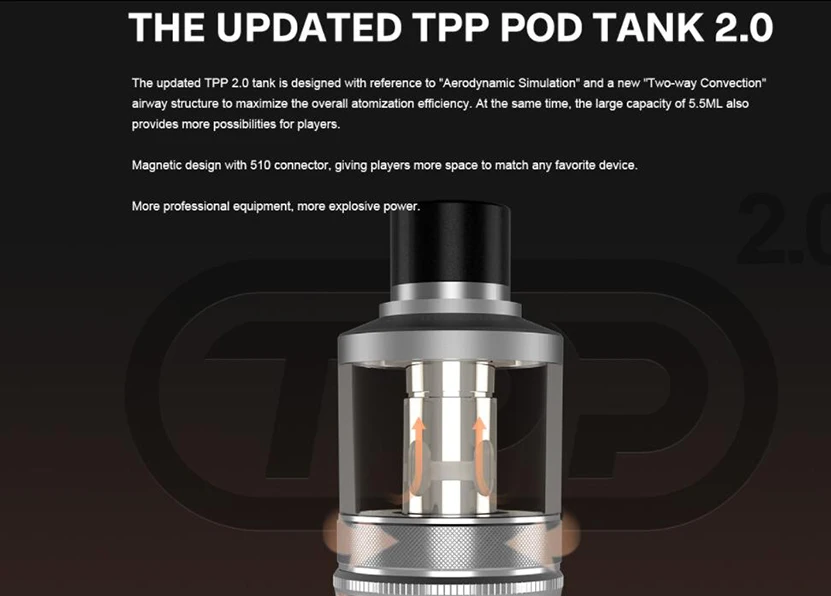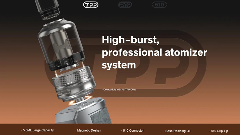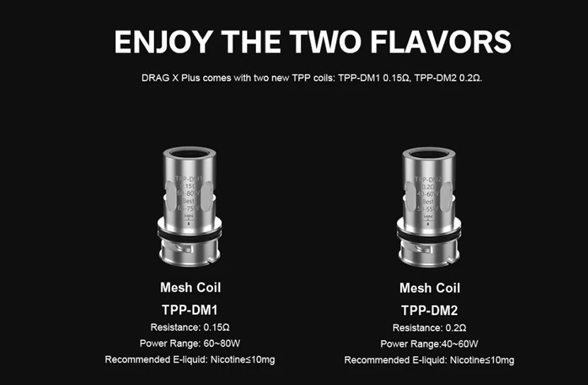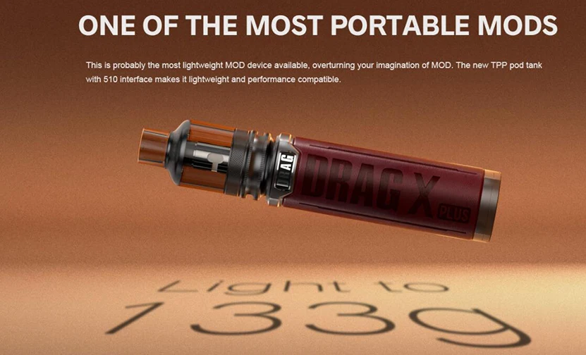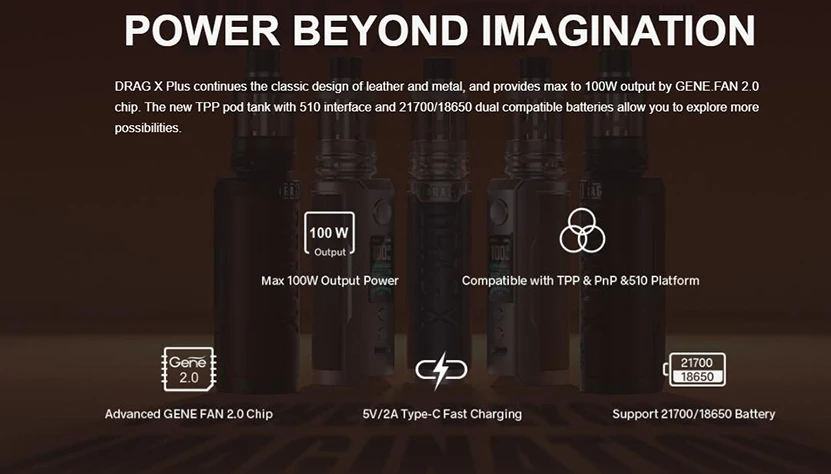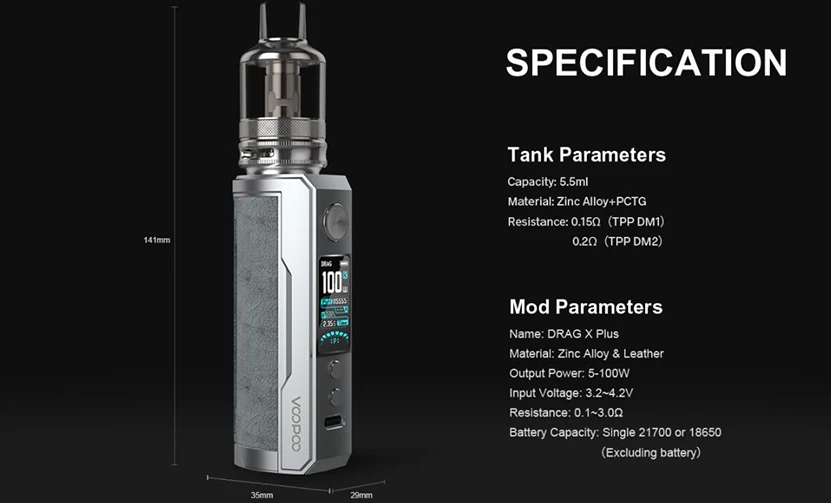 Drag X Plus Professional Edition Kit comprend Drag X Plus Professional Edition Mod et TPP 2.0 Pod Tank. Il est fabriqué en zinc, cuir et PCTG pour une sensation de main plus sympathique et confortable. Drag X Plus Professional Edition Mod prend en charge une seule batterie 18650/21700 et a une plage de puissance de sortie de 5-100W, il prend également en charge le mode VW/SMART/RBA, vous pouvez obtenir les informations de vapotage facilement avec un design d’écran TFT de 0.96 pouces. Le réservoir de dosettes TPP 2.0 a une grande capacité de jus électronique de 5.5ml et est compatible avec les bobines TPP. Vous pouvez utiliser d’autres atomiseurs sur Drag X Plus Professional Edition Mod avec connexion 510.
