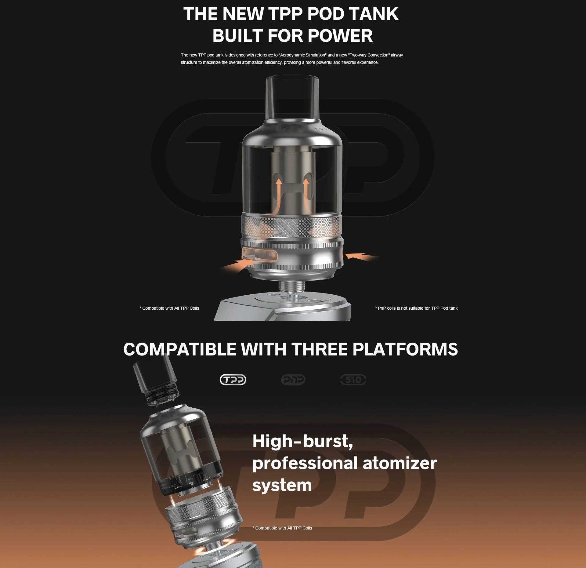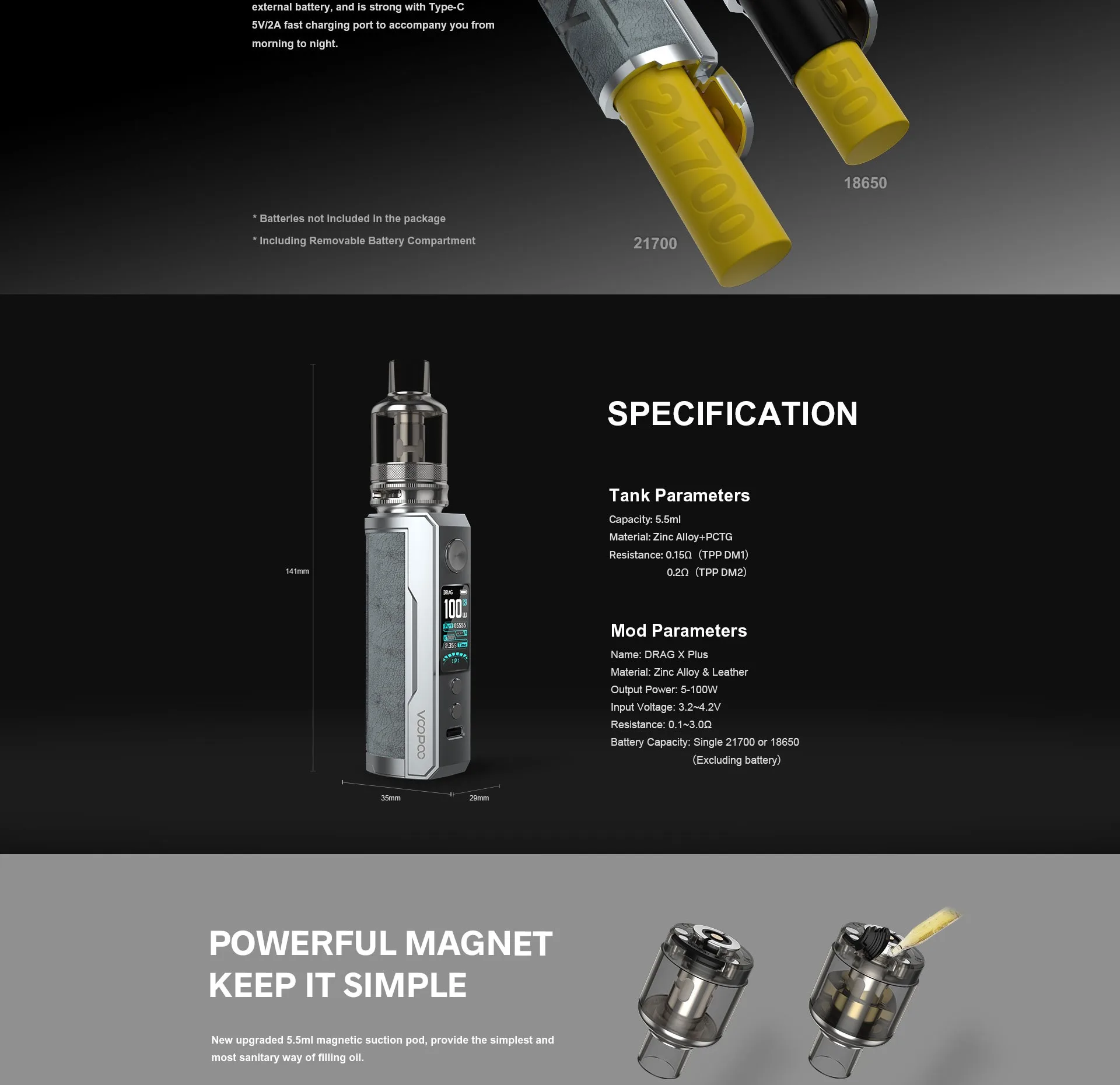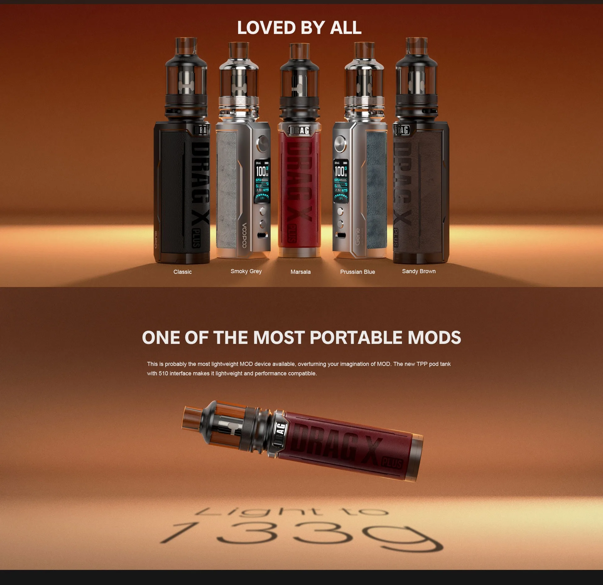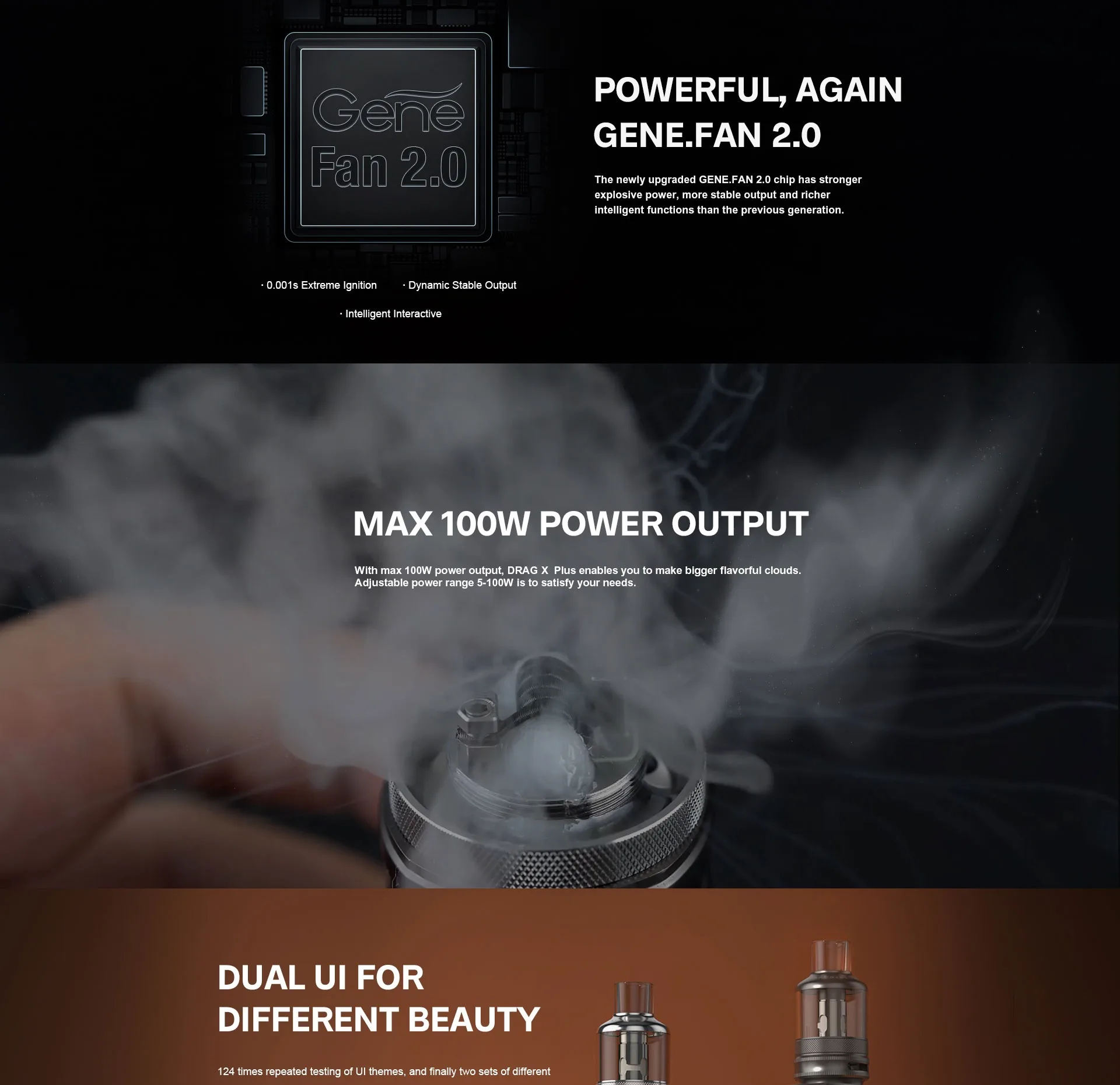 Le Kit Drag X Plus est fabriqué en cuir et en métal et a une puissance de sortie maximale de 100W avec la puce avancée GENE.FAN 2.0. Il est d’une grande compatibilité de batterie et peut fonctionner avec une seule batterie 18650 ou 21700. C’est l’un des appareils mod les plus portables. Le Kit Drag X Plus dispose d’un écran TFT de 0.96 pouces et de deux thèmes d’interface utilisateur (fer et noyau). De plus, il offre deux modes de vapotage: mode intelligent pour les débutants, mode RBA pour le bricolage. Il est livré avec le nouveau réservoir de dosette TPP conçu en référence à la «Simulation aérodynamique» et une nouvelle structure des voies respiratoires «Convection bidirectionnelle» pour offrir une expérience de vapotage plus puissante et plus délicieuse. Le réservoir de dosette TPP est compatible avec toutes les bobines TPP et a une capacité de 5.5ml de jus électronique. La conception magnétique est également appliquée au réservoir de dosette TPP. Les bobines de la série TPP sont conçues avec la technologie qui peut augmenter la surface interne de l’atomiseur et augmenter la vitesse de chauffage pour fournir une saveur plus délicate. La bobine 0,15 ohm et la bobine 0,2 ohm sont incluses. Le Kit Drag X Plus est également compatible avec le réservoir PnP Pod et la plate-forme 510.